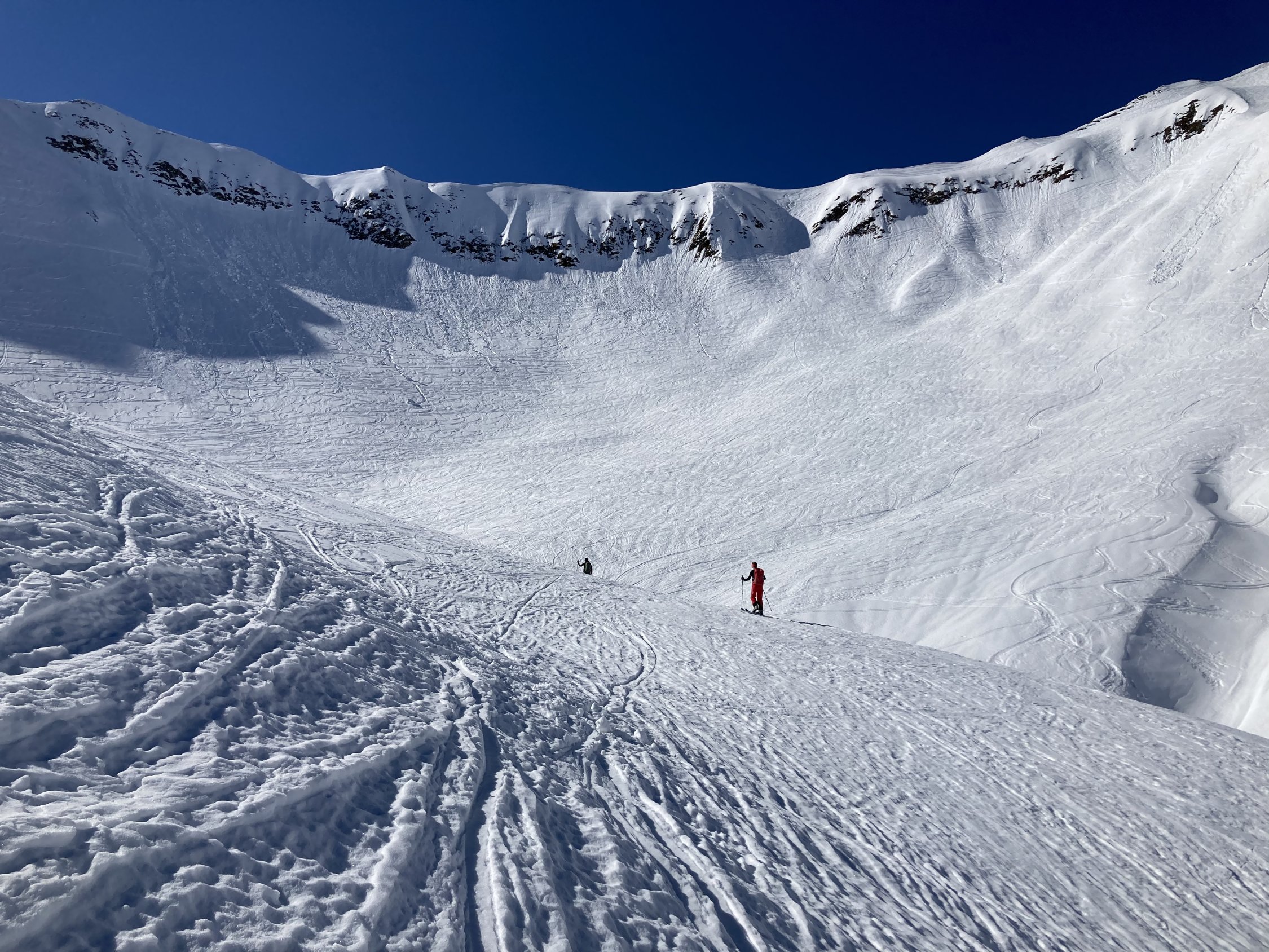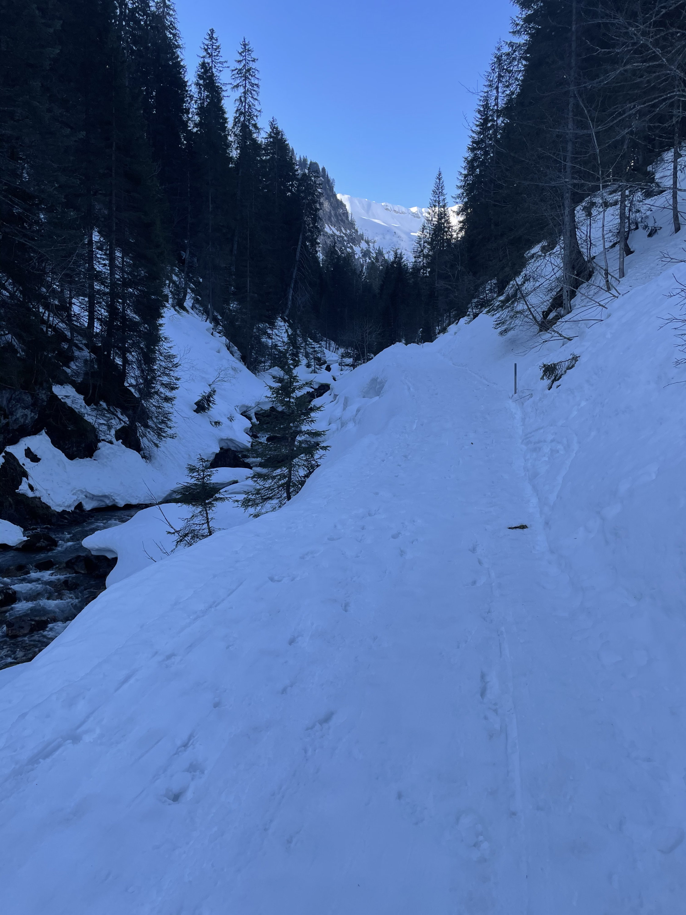 Schneedecke geschlossen bis zum Parkplatz. Harscheisen sind von Vorteil. Ca. 11 Uhr hat es aufgefirnt und Abfahrt war sehr schön. Im Schatten sehr hart. Viele Fußstapfen in der Aufstiegsspur.