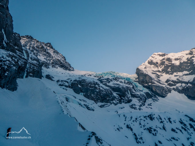 Ab Wellhornsattel wenig traversierend absteigen und durch die Mulde hinauf zum Skidepot, jedoch mit genügend Abstand von dem Gletscherabbruch Nördlich des Mittelhorn. Ab Wellhornsattel bis Skidepot und Fussaufstieg ziemliche Bise.