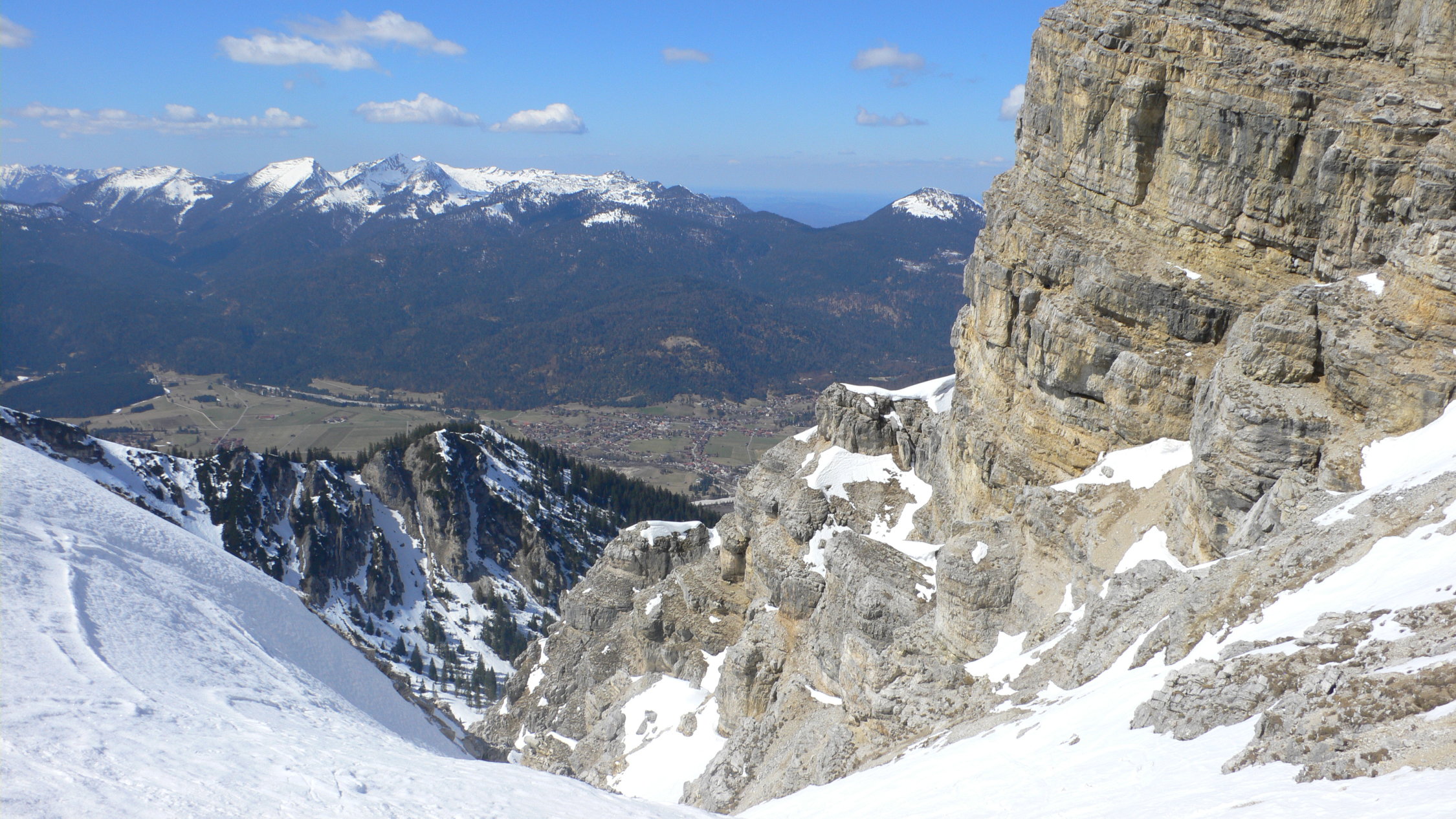 Abfahrt vom Sattel der Schöttelkarspitze via Westrinne: hier und da gut fahrbar wo kein Lawinenschnee lag und wo die Sonne hineinschien. Ab 1800mm nach unten hinaus schön zu fahren, auch im Bachbett bis ca. 1200m. Nun mehrheitlich laufen hinab nach Krün. Dort kam ich um 15:00h an.