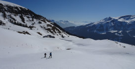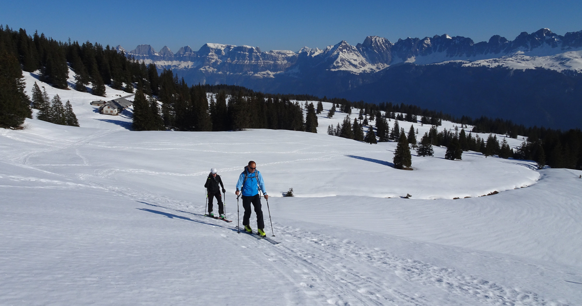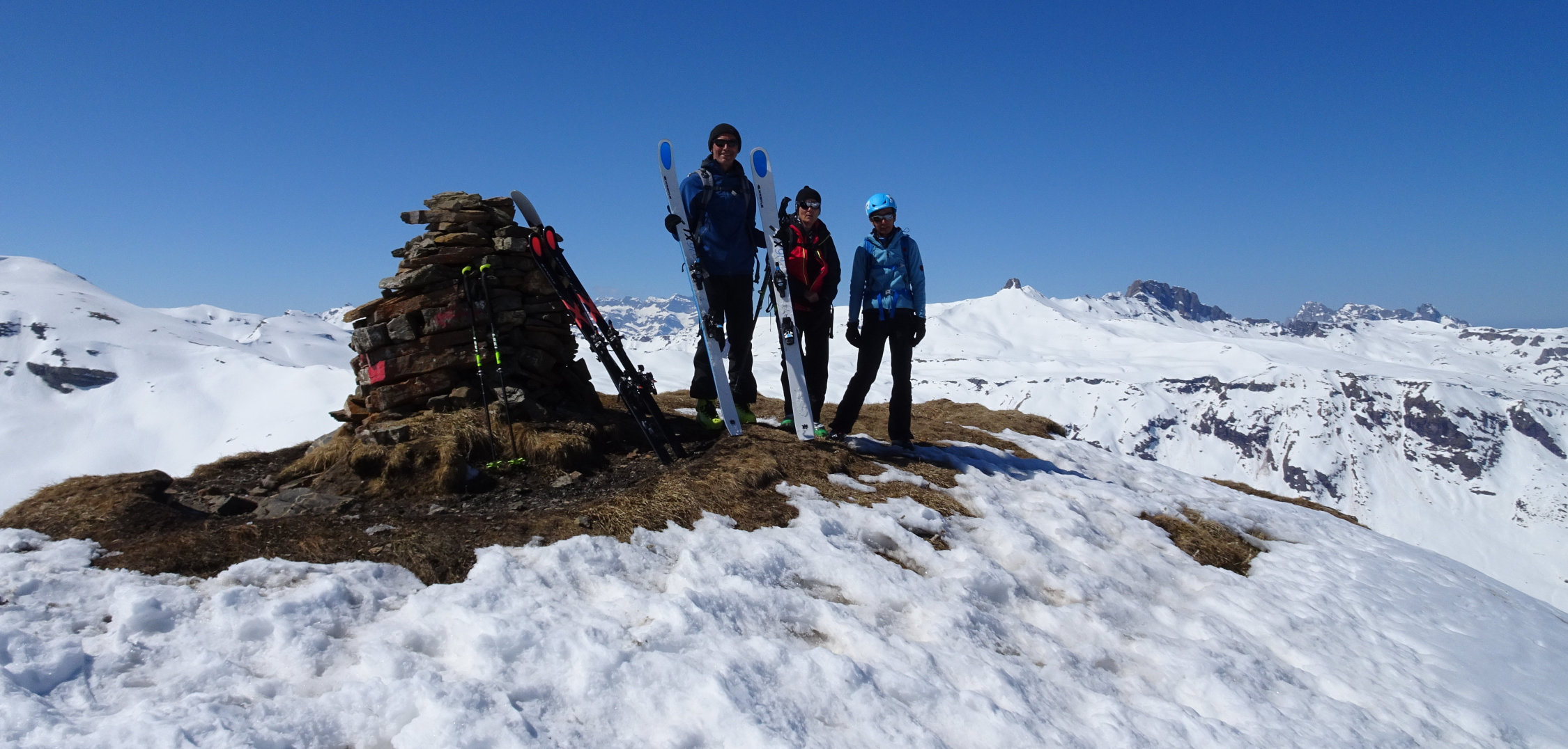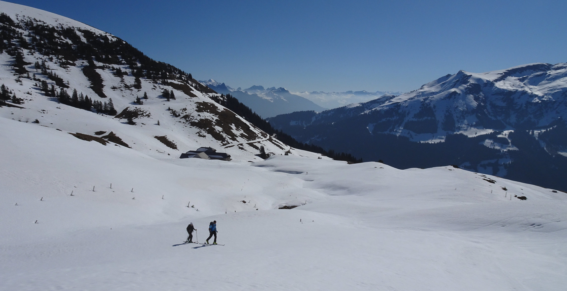 Wir sind vom Chapfensee über Tamons zum Madhüttli und weiter über den Walachamm zum Guli aufgestiegen. Die Abfahrt führte über den wunderschönen Gipfelhang hinunter zur Chläui und über Cholschlag hinaus zum Schwarzenberg und mit wenigen aperen Tragestellen zurück bis zum Chapfensee.