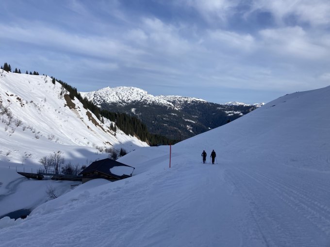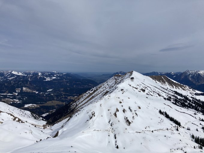 Noch ausreichend Schnee vom Parkplatz weg. Die Talabfahrt wird nun nicht mehr gewalzt, aus diesem Grund teilweise recht ruppig. Nach der klaren Nacht pickelhart gefroren. Harscheisen aber nicht notwendig. Die Querung unter den Felsen hat gute Trittspuren. Heute hatten um 11:00 / 11:30 Uhr lediglich der direkte Gipfelhang aufgefirnt. Der Rest war noch sehr eisig. Das untere drittel im Tal dann etwas weich aufgrund der Temperaturen.
