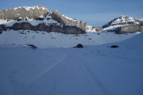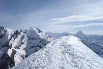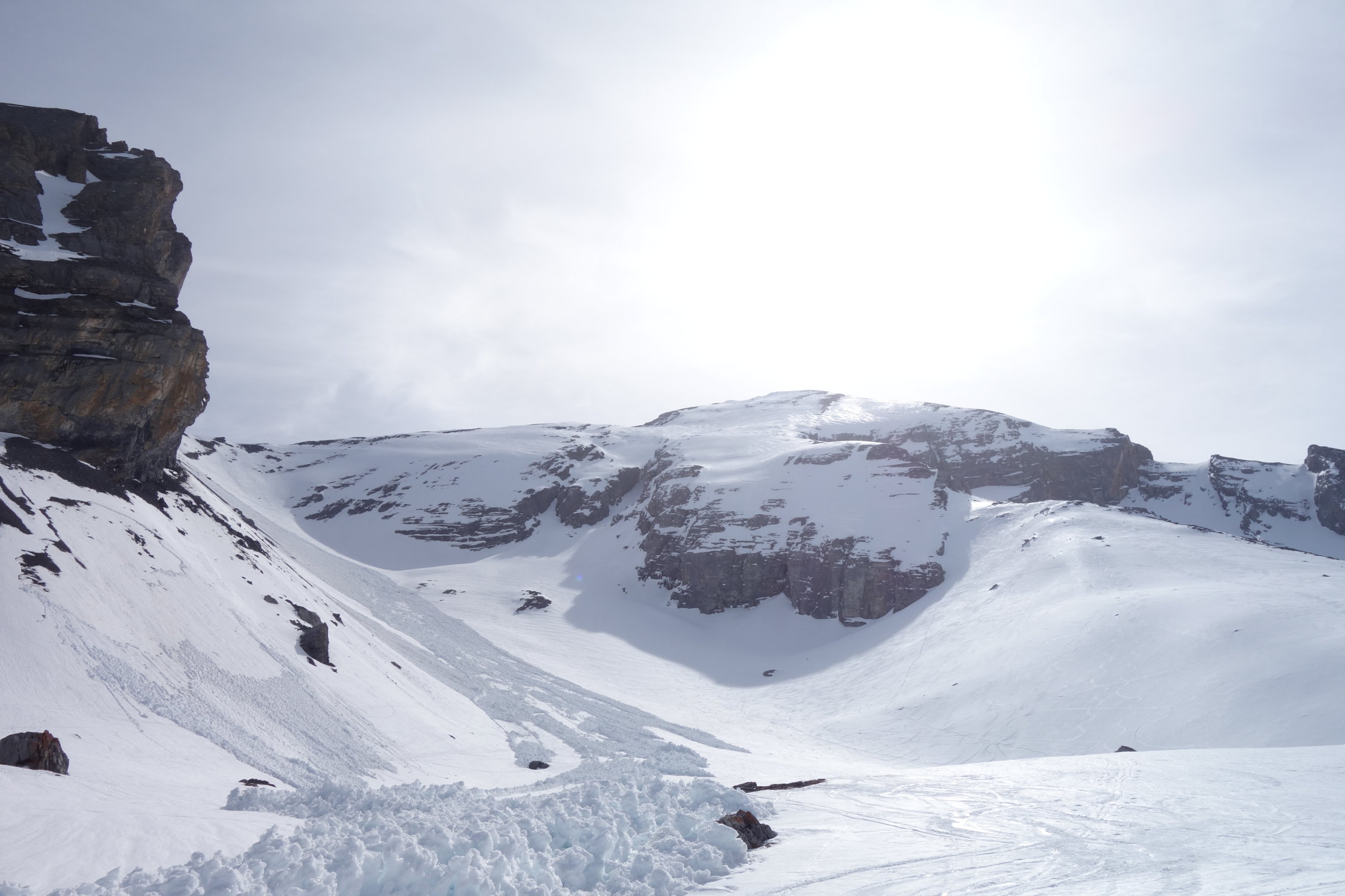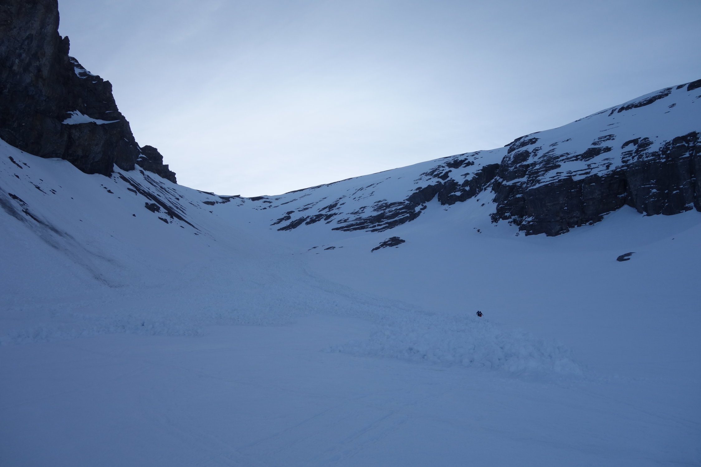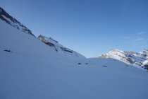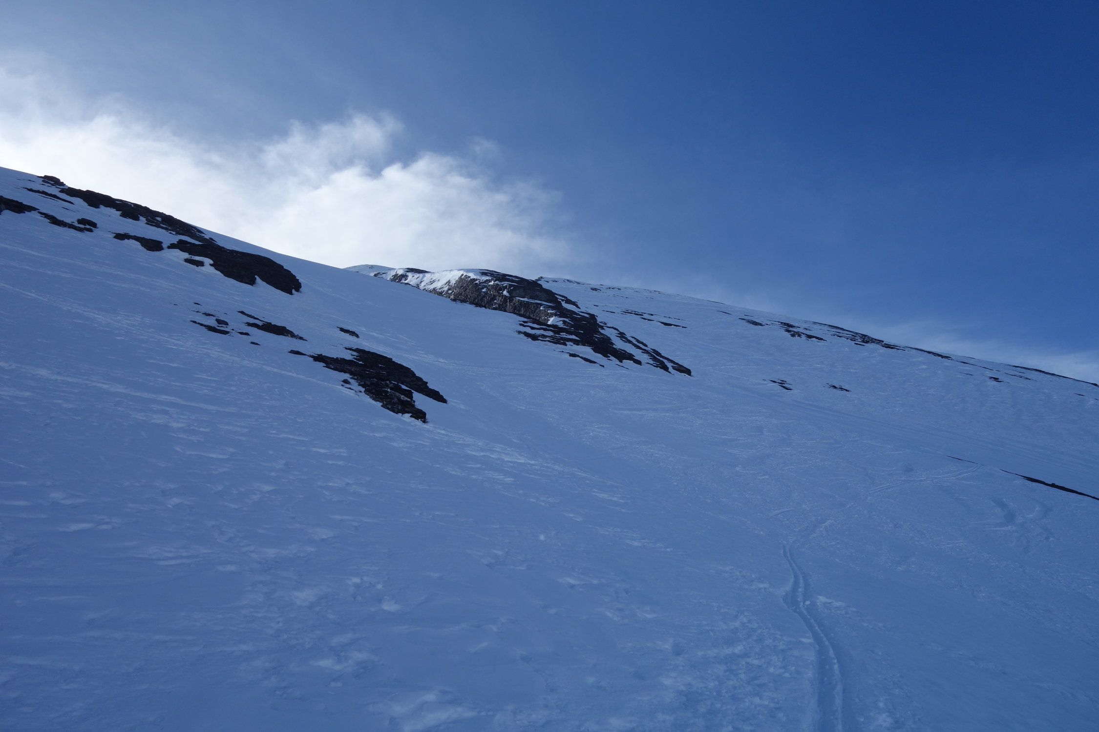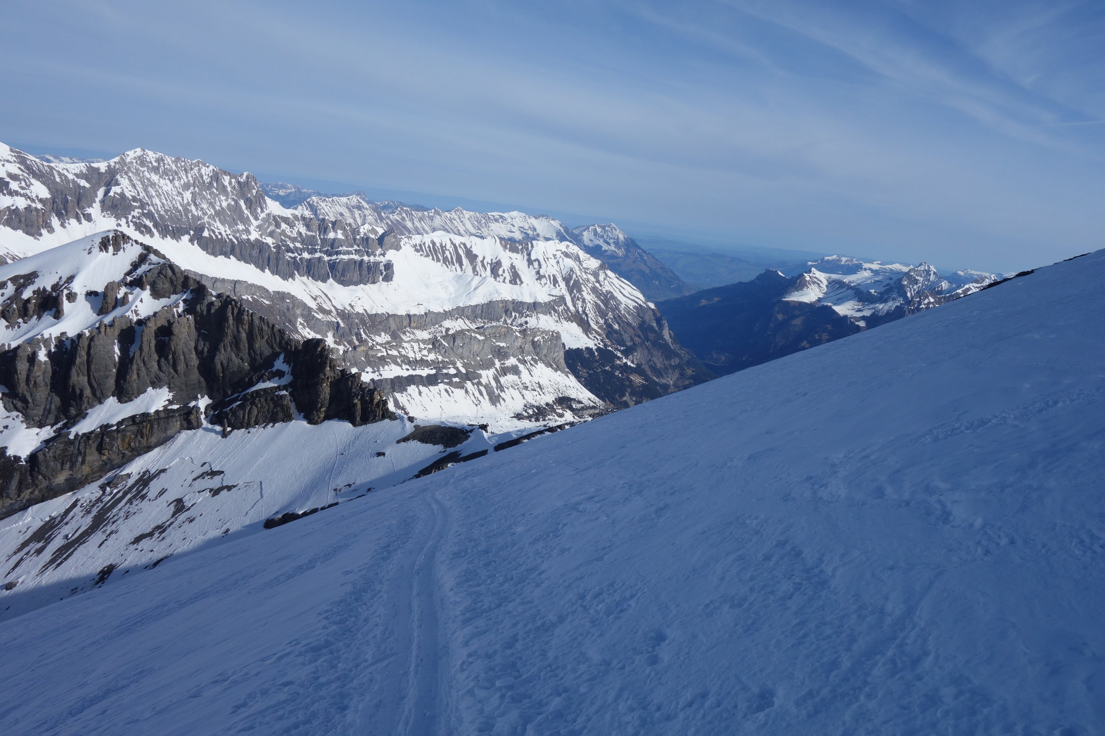 Bezüglich Sulz hatte ich eigentlich auf den südexponierten Hang des kleinen Rinderhorns spekuliert, aber dort ist grossflächig eine Nasschneelawine abgegangen, die sich komplett durch das Rindertäli bis etwa 2300 m geschoben hat. Entsprechend Aufstieg auf der orographisch linken Seite. Passable Spur bis zum Gipfel, es kommt aber immer mehr Steinzeug raus.