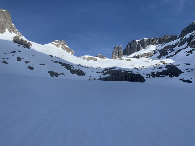 Start 6:40 an der Barriere Färningen bei 0 Grad. Strasse ab Barriere sehr gut mit Schnee bedeckt. Auf guter Spur längs des Goretzmettlenbachs - hier bleibt man mit Vorteil auf der Talsohle, das spart eine mühsame Traverse eines sehr grossen Nassschneeabgangs - via Rotgand - Juzfad - Rossfirn hoch zum Chuefadpass. Variante über Rossplangg ist ebenfalls gespurt. Etwa zur Hälfte mit Harscheisen da hart gefroren. Meist recht homogene Schneeoberfläche. Im oberen Becken des Spannortfirns Presspulver, abgefellt & abgefahren. Gute Spur hinauf zum Skidepot. Randspalte nach Skidepot gut passierbar, wenn aufgeweicht mit Vorsicht, es hat bereits Löcher. Sehr gute, hart gefrorene (Tritt)Spur bis Gipfel. Erstes Couloir steil mit sehr gutem Trittschnee. Oberhalb fixes Material für allfällige Sicherung vorhanden. Zweite Felsstufe aper, hier ebenfalls Sicherungsmöglichkeit von oben. Gipfelfelsen aper. Am Gipfel zügiger Wind. Insgesamt äussert gute Verhältnisse für den Fussaufstieg. Abfahrt Spannortgletscher auf schönen Presspulver. Traverse zum Bärenhorn um 12 Uhr noch hart. Abfahrt via Chuefadfirn bis gegen 2600 m ok, etwas ruppig, da kaum aufgefirnt. Darunter dann optimal aufgefirnt, sehr schön zu fahren bis zur Passstrasse.