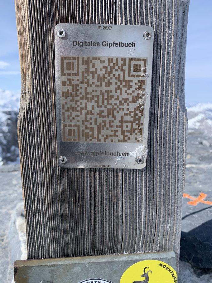 Am Spannortgipfelkreuz noch eine QR Code Plakette für das elektronische Gipfelbuch montiert.