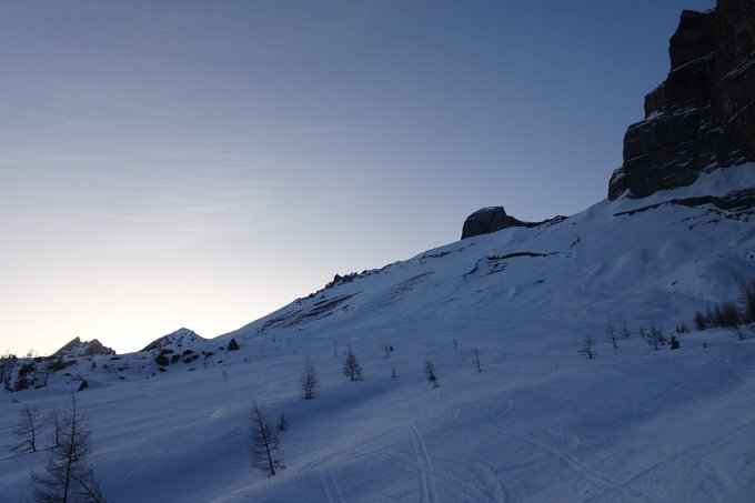 - Ab Hütte durchgehend mit Harscheisen gelaufen. Gegen oben zunehmend anspruchsvoller, hart und teils schlechter Griff. Musste deshalb gewisse Strecken auf die Steighilfe verzichten. Spur glücklicherweise ziemlich flach angelegt.