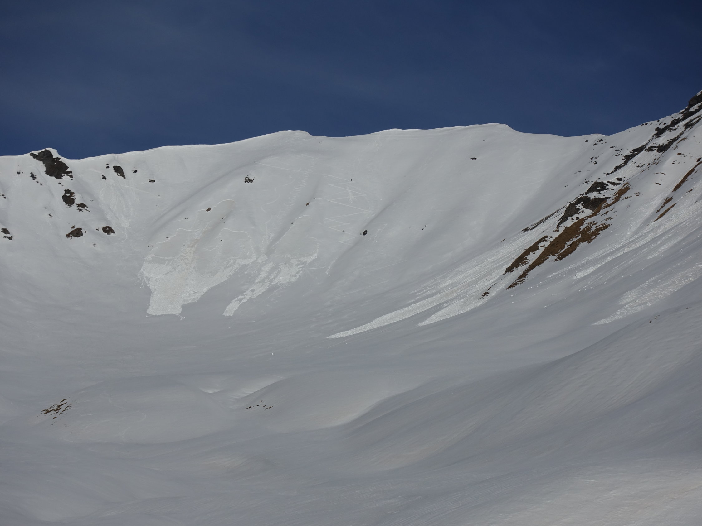 Die Lawinenkegel im Gipfelhang waren Nassschneelawinen, wahrscheinlich auf einer Saharastaubschicht abgeglitten. Allerdings ist der Hang 40 Grad steil. Aber am Morgen keine Gefahr.