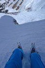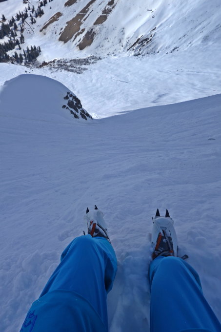 Enneigement continu de la ferme au sommet. Montée avec les couteaux dans les pentes nord en neige plutôt dure. J'ai fini en crampons les derniers 50m sous le col, même si ça passait à ski. Pas de soucis pour passer la corniche.