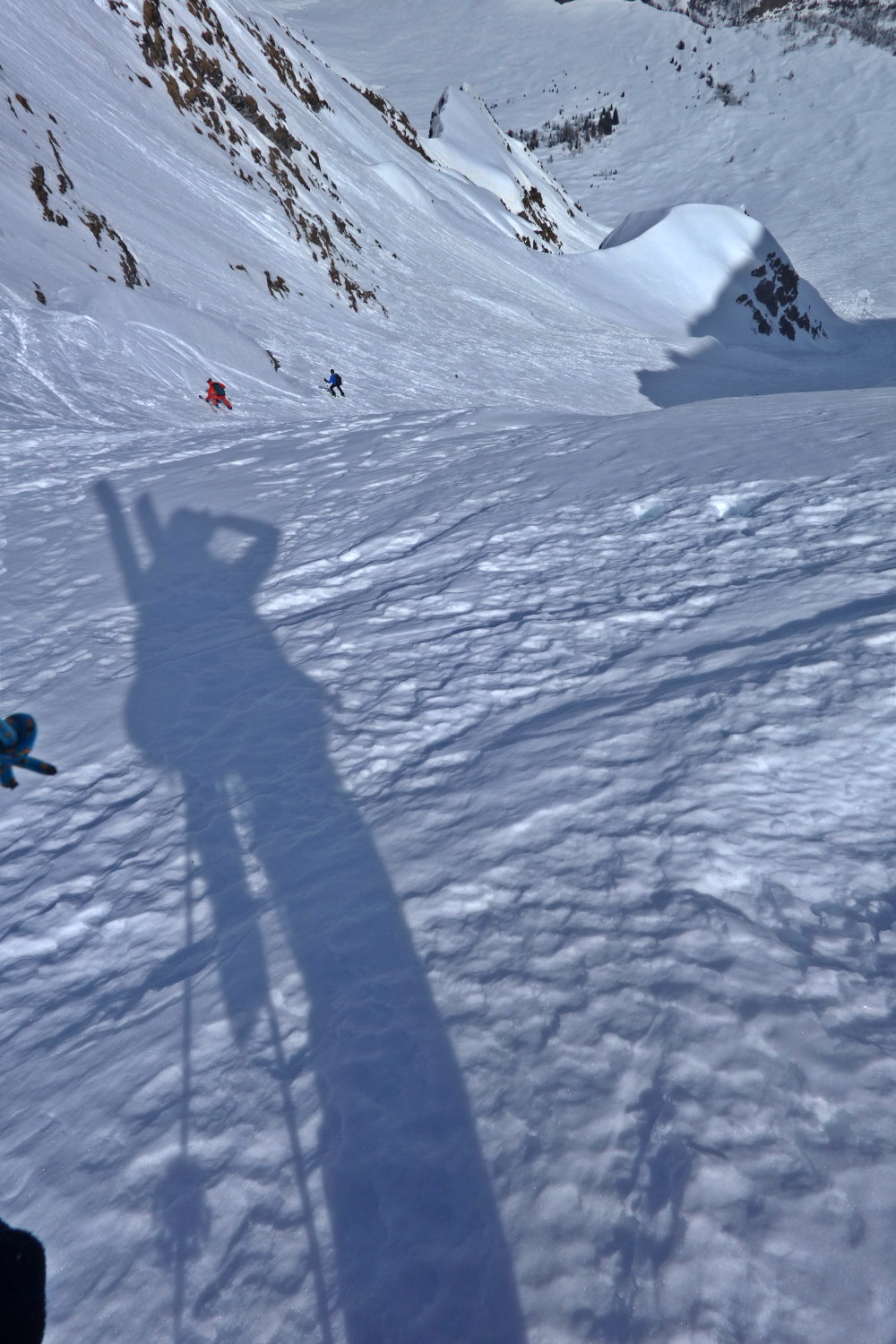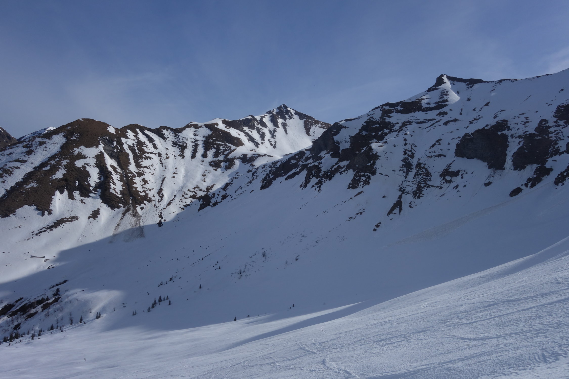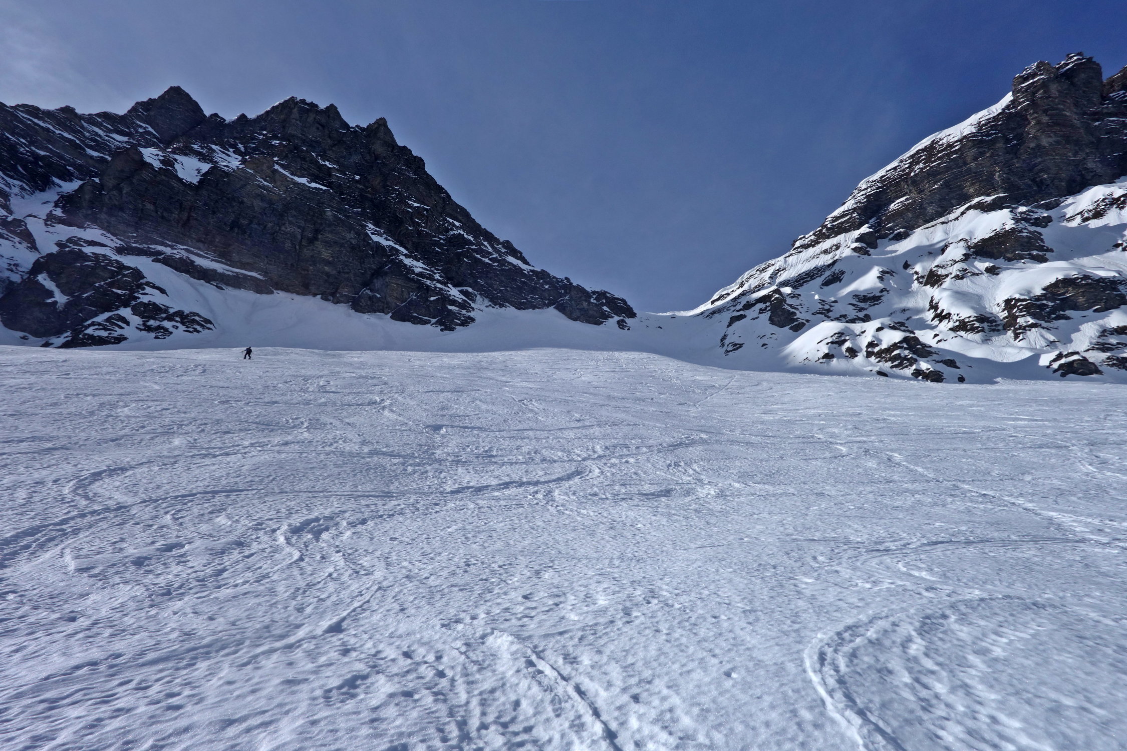 A la descente: toutes les neiges (sauf belle poudre): dure en haut dans la pente ouest. Sous le col un mélange de neige croutée, dure, vieille poudre lourde, le tout dans une pente pas bien lisse du tout entre les traces, les boules etc... Descente pas évidente mais agréable quand même. steibode: entre 2000m et 1500m, du grand ski. Neige parfaitement revenue, moquette 5 étoiles, trop bon. Puis de plus en plus lourde jusqu'au point de départ.