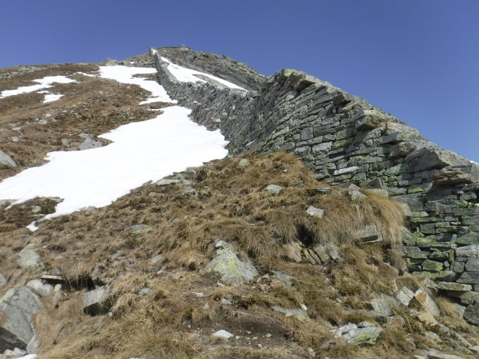 Tourenbeginn um 09:00 Uhr bei 15°C unter blauem Himmel. Oberhalb von 1500 m (Larecc und Corte Nuovo) lag noch genügend Altschnee, wo Scheeschuhe hilfreich gewesen wären. Jedoch wegen dem starken Windwurf musste ich ständig die Sommerroute verlassen und mich so durch den Wald „schlagen“ bis zur oberen Waldgrenze. Auch im Abstieg durch den Wald nach Corte Nuovo war das Navigationsgerät eine starke Hilfe. Auch hier schnallte ich die SS lieber hinten auf. Auf Fuß- und SS-Spuren traf ich erst im Abstieg ab Corte Nuovo (SS-Trail). Im kleinen schwarzen Gipfelbuch vom 8.8.2020 schrieb ich ersten Eintrag im Jahr 2021 ein.