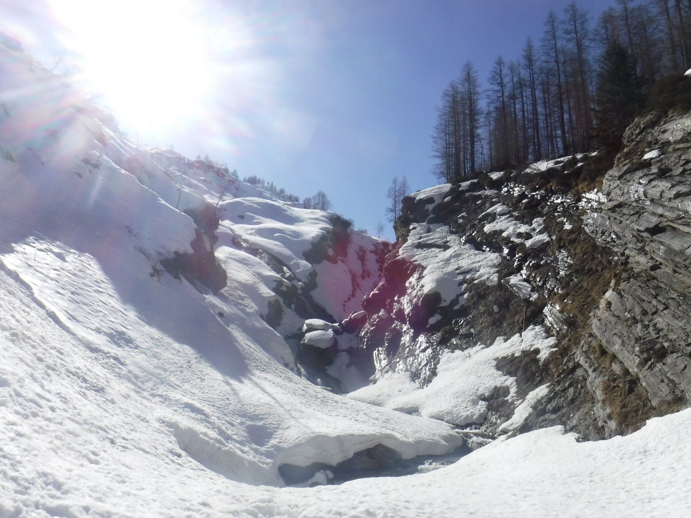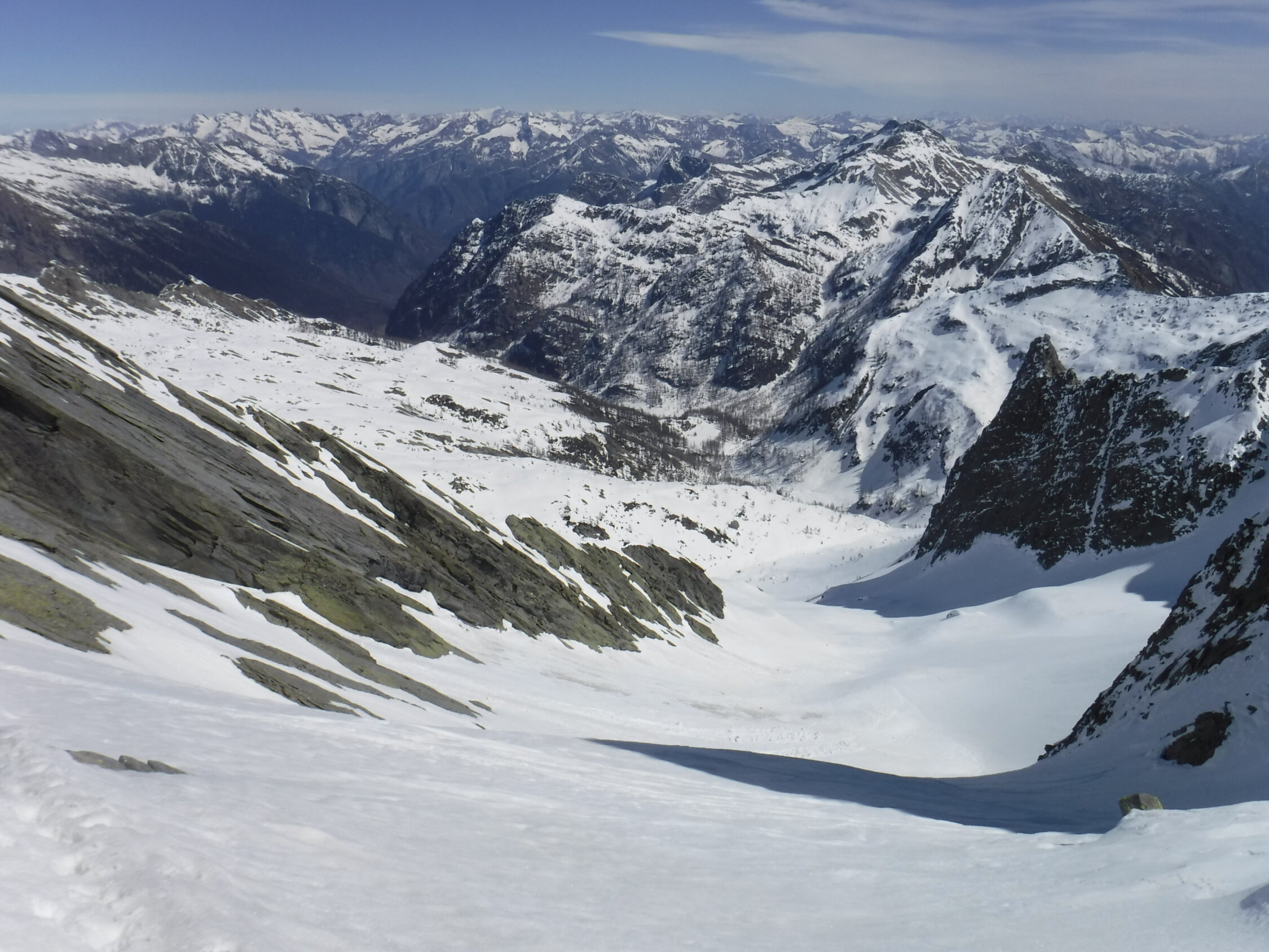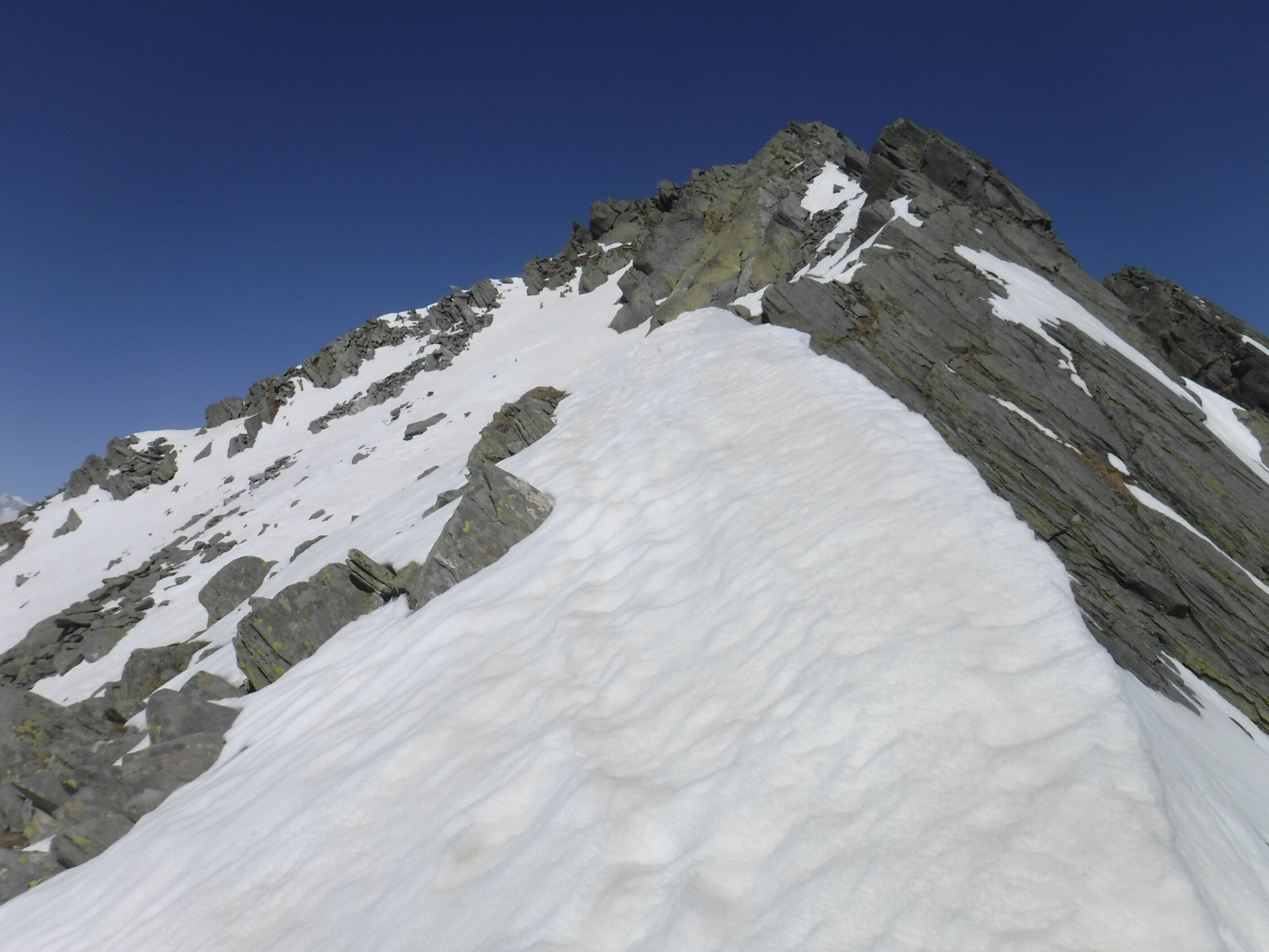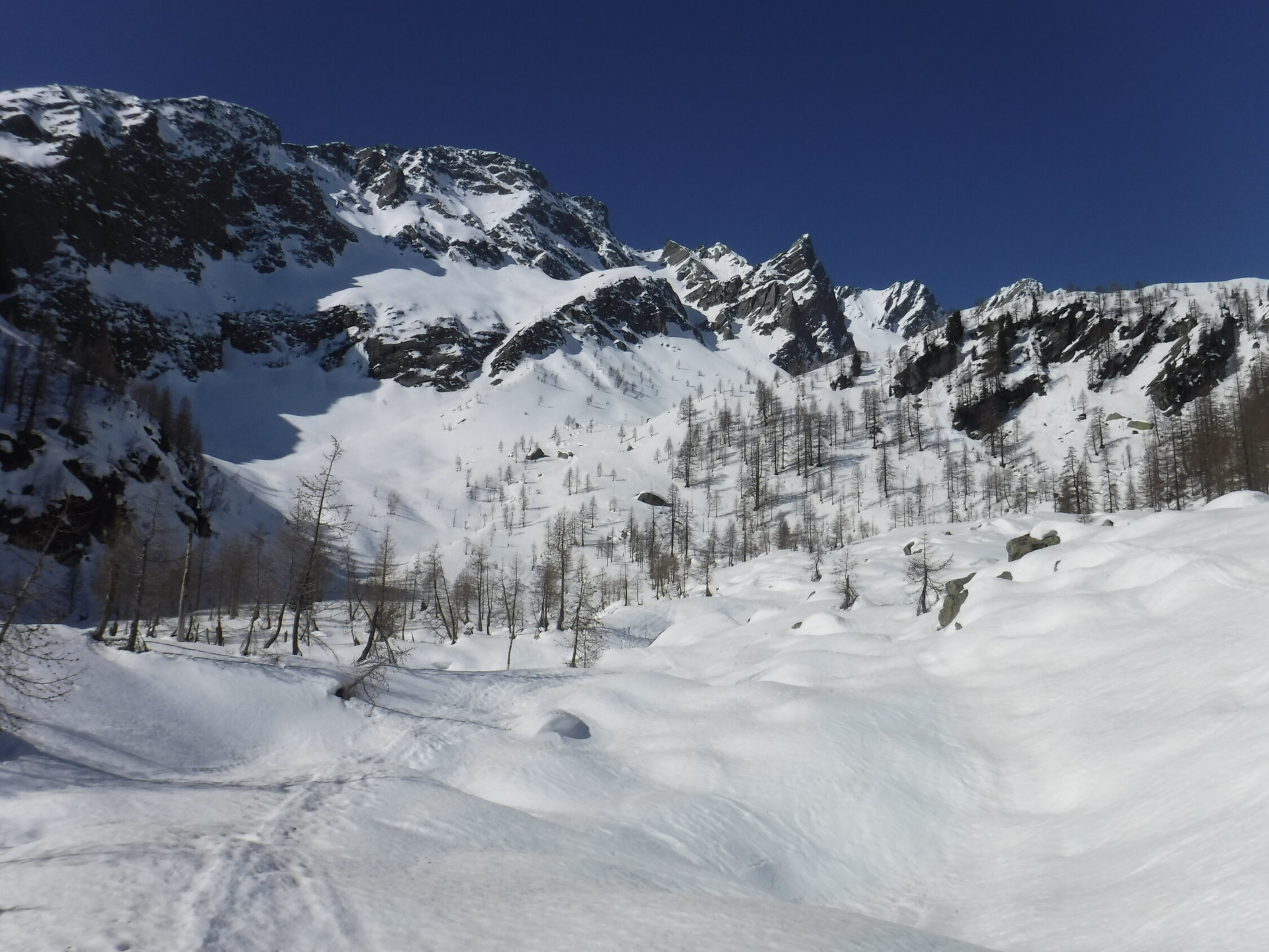 Tourenbeginn um 07:30 Uhr bei 4°C unter blauem Himmel. Da die Route überwiegend auf der Nordseite verläuft, lag noch viel Schnee. Allerdings überall verfirnt, wo länger die Sonne hinkam. Auf- und Abstieg über den kurzen Südgrat mit Steigeisen. Oberes Canalone Nord bot Trittschneeverhältnisse, bis auf den Stellen, wo der Gleitschnee sich sammelte („Kartoffelacker“). Mit Steigeisen kam ich alledings zügig durch. Alle Felswände waren nach diesen Temperaturen in den letzten Tagen bereits „entladen“, so dass keine Lawinengefahr mehr bestand. Auch war es nicht zu warm, als dass Steinschlaggefahr drohte. Schwach waren oben noch Skiabfahrtspuren erkennbar. Wegen den vielen nach unten zunehmenden alten Gleitschneeansammlungen war mir das Risiko allerdings zu hoch, im unteren Canalone Nord Felsgeröll, Lawinenansammlungen, oder Bruchharsch vorzufinden. So zog ich die Umgehungsvariante ab P 1900 linksherum ins Bachtal des Rio Colobiasca vor. Die Furt nach der Balm de la Rossa war unpassierbar wegen zu hohem Schmelzwasser. Darum lief ich den Umweg rechtsherum hinab zur Brücke (P 1285) über den Bach.