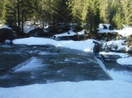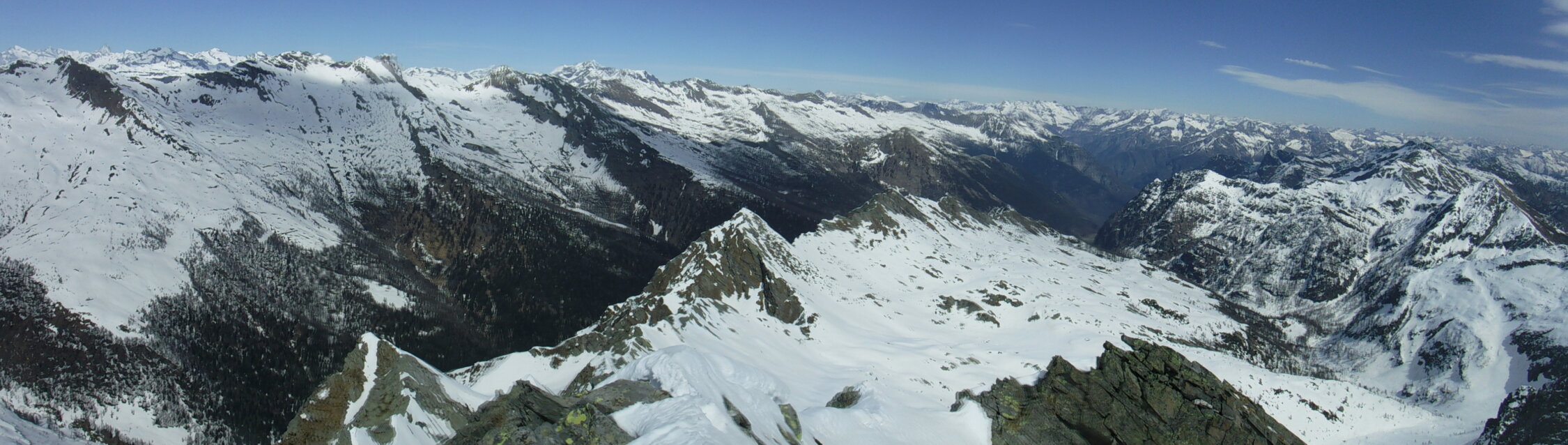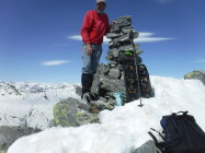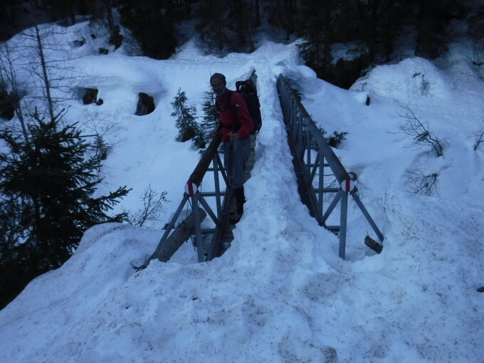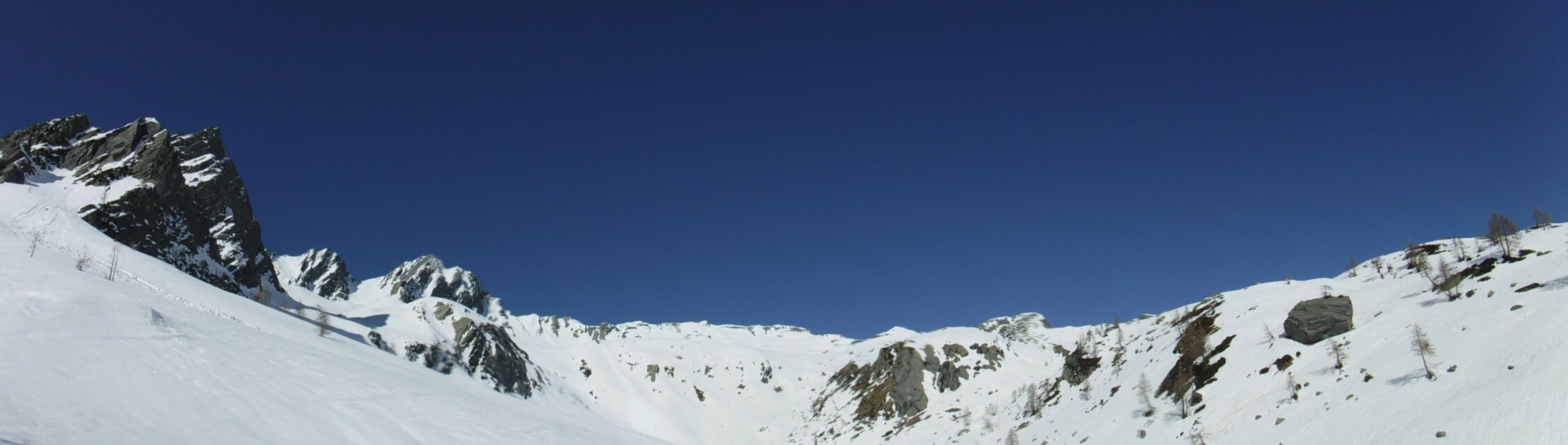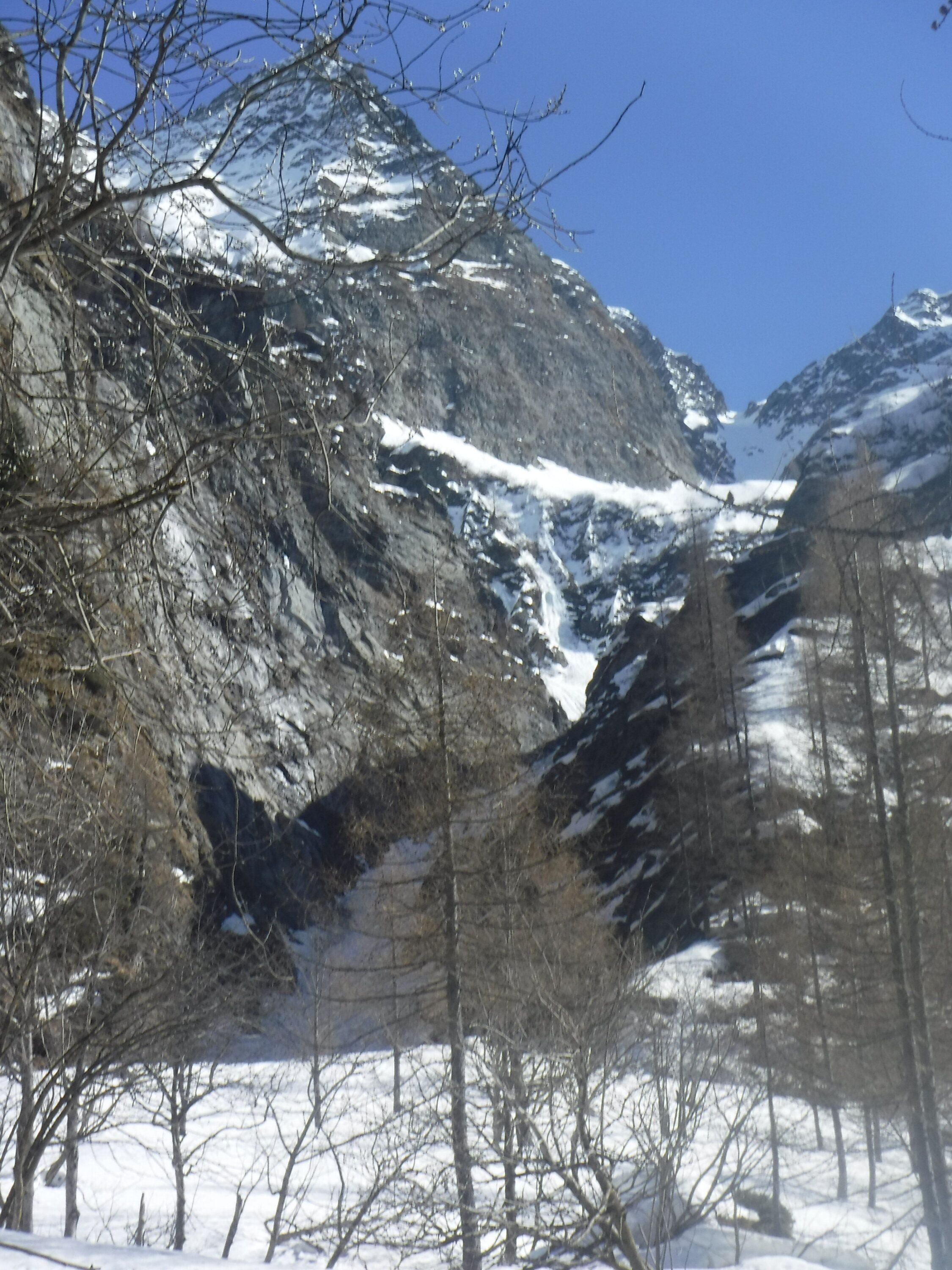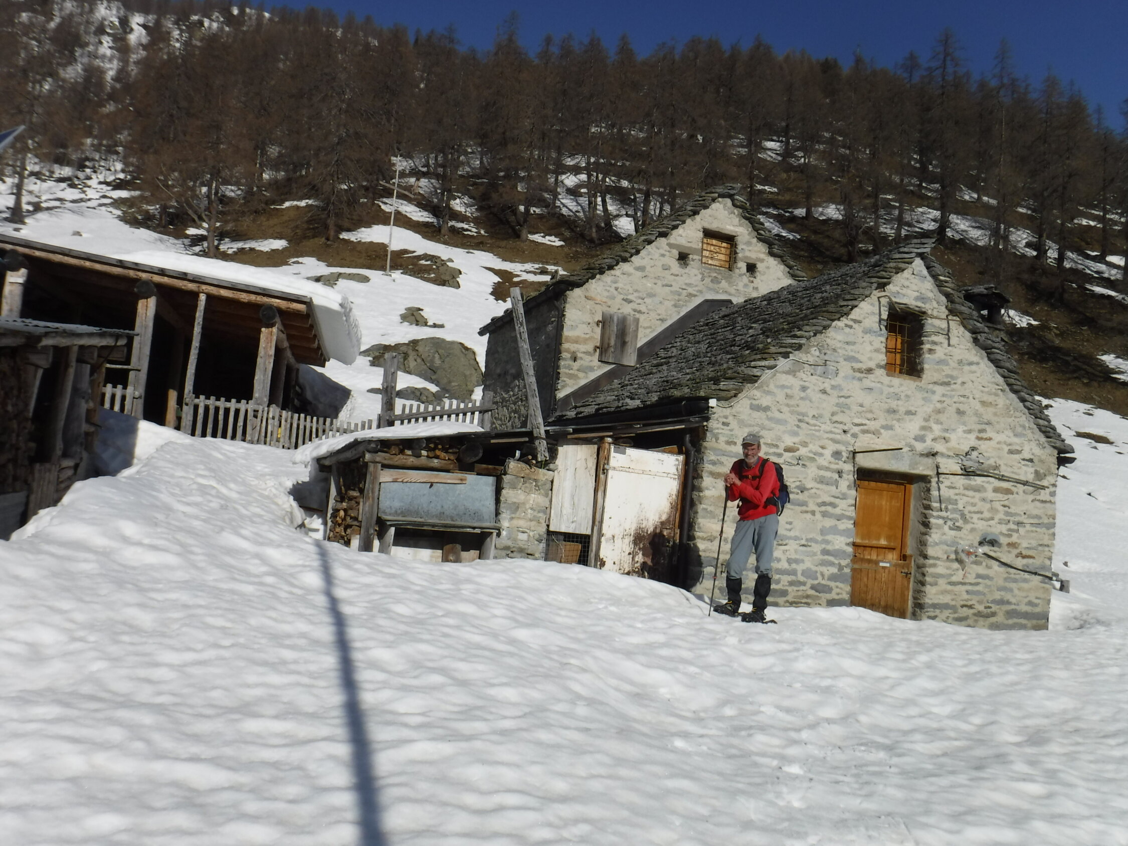 Tourenbeginn um 07:30 Uhr bei 4°C unter blauem Himmel. Da die Route überwiegend auf der Nordseite verläuft, lag noch viel Schnee. Allerdings überall verfirnt, wo länger die Sonne hinkam. Auf- und Abstieg über den kurzen Südgrat mit Steigeisen. Oberes Canalone Nord bot Trittschneeverhältnisse, bis auf den Stellen, wo der Gleitschnee sich sammelte („Kartoffelacker“). Mit Steigeisen kam ich alledings zügig durch. Alle Felswände waren nach diesen Temperaturen in den letzten Tagen bereits „entladen“, so dass keine Lawinengefahr mehr bestand. Auch war es nicht zu warm, als dass Steinschlaggefahr drohte. Schwach waren oben noch Skiabfahrtspuren erkennbar. Wegen den vielen nach unten zunehmenden alten Gleitschneeansammlungen war mir das Risiko allerdings zu hoch, im unteren Canalone Nord Felsgeröll, Lawinenansammlungen, oder Bruchharsch vorzufinden. So zog ich die Umgehungsvariante ab P 1900 linksherum ins Bachtal des Rio Colobiasca vor. Die Furt nach der Balm de la Rossa war unpassierbar wegen zu hohem Schmelzwasser. Darum lief ich den Umweg rechtsherum hinab zur Brücke (P 1285) über den Bach.