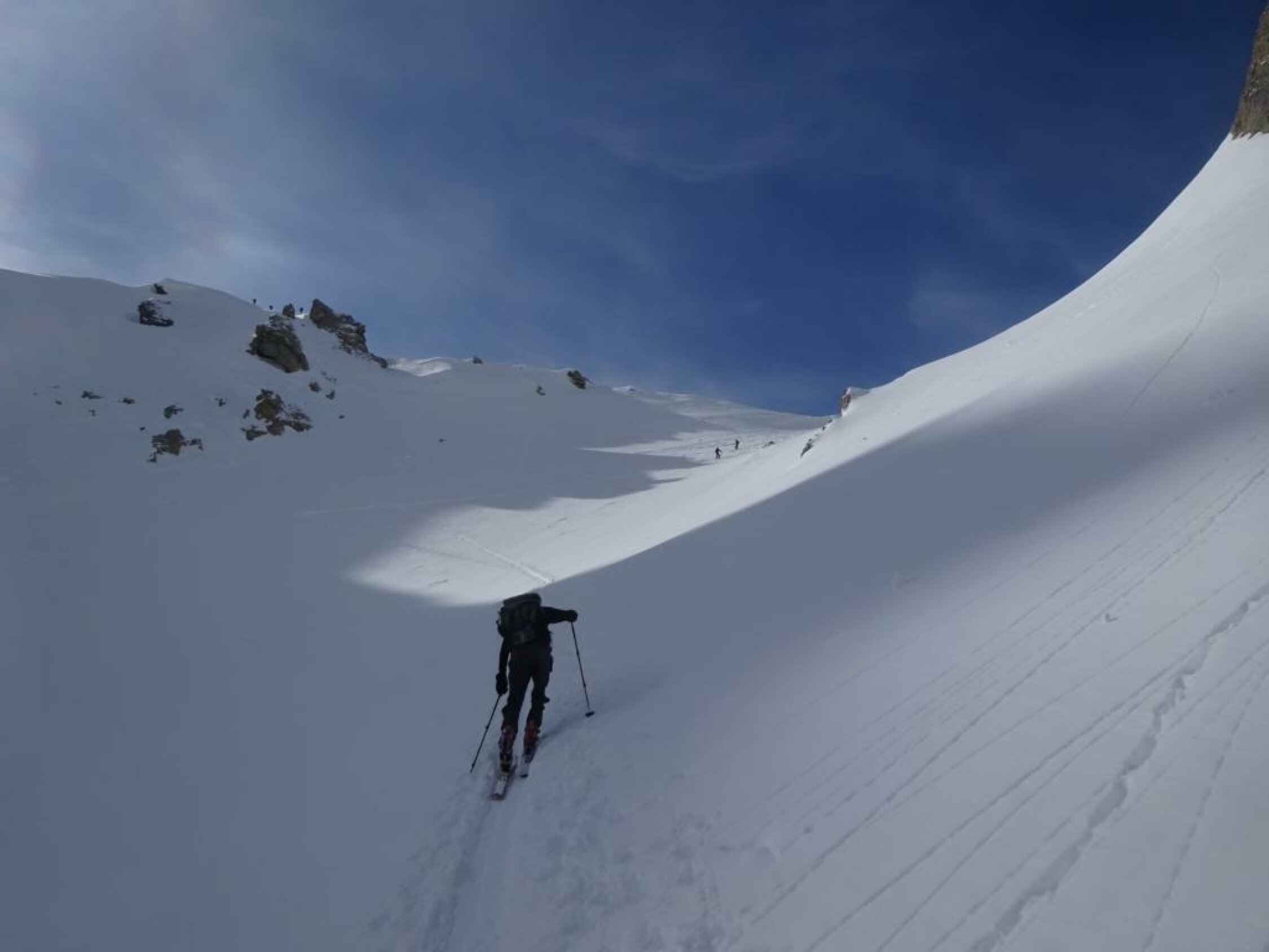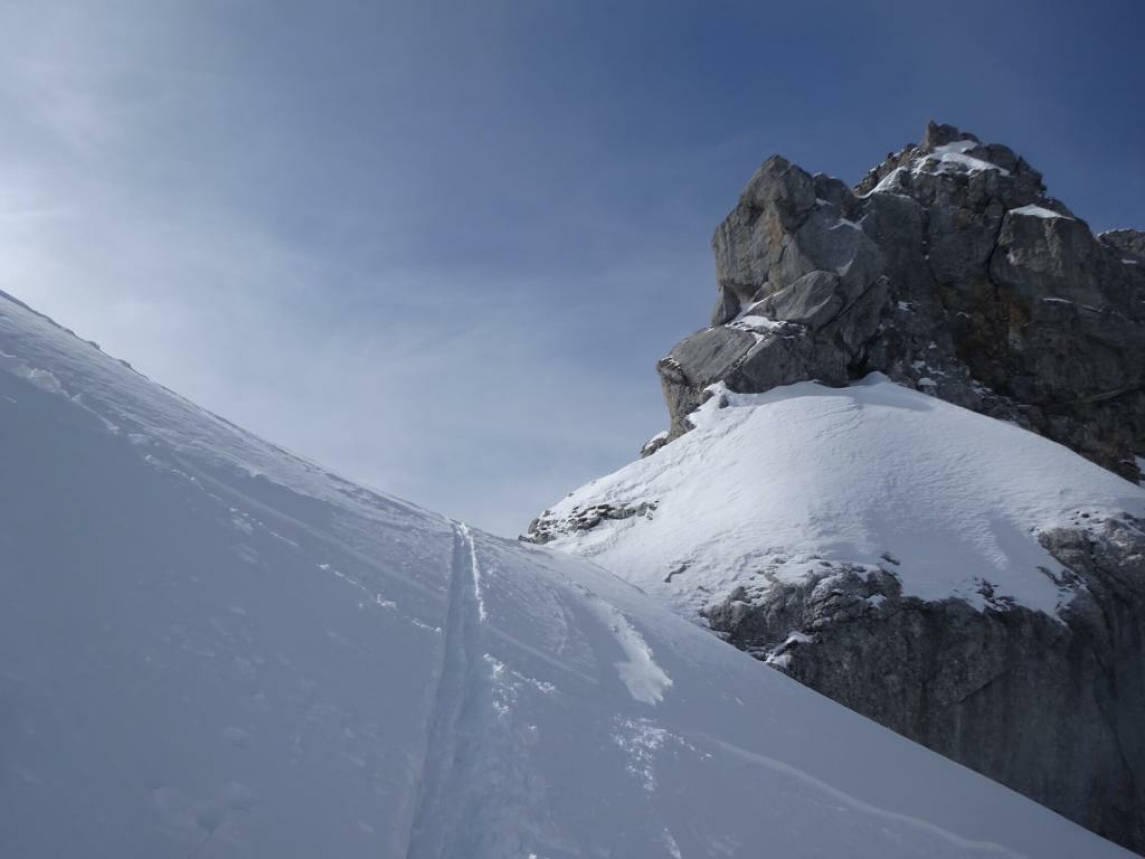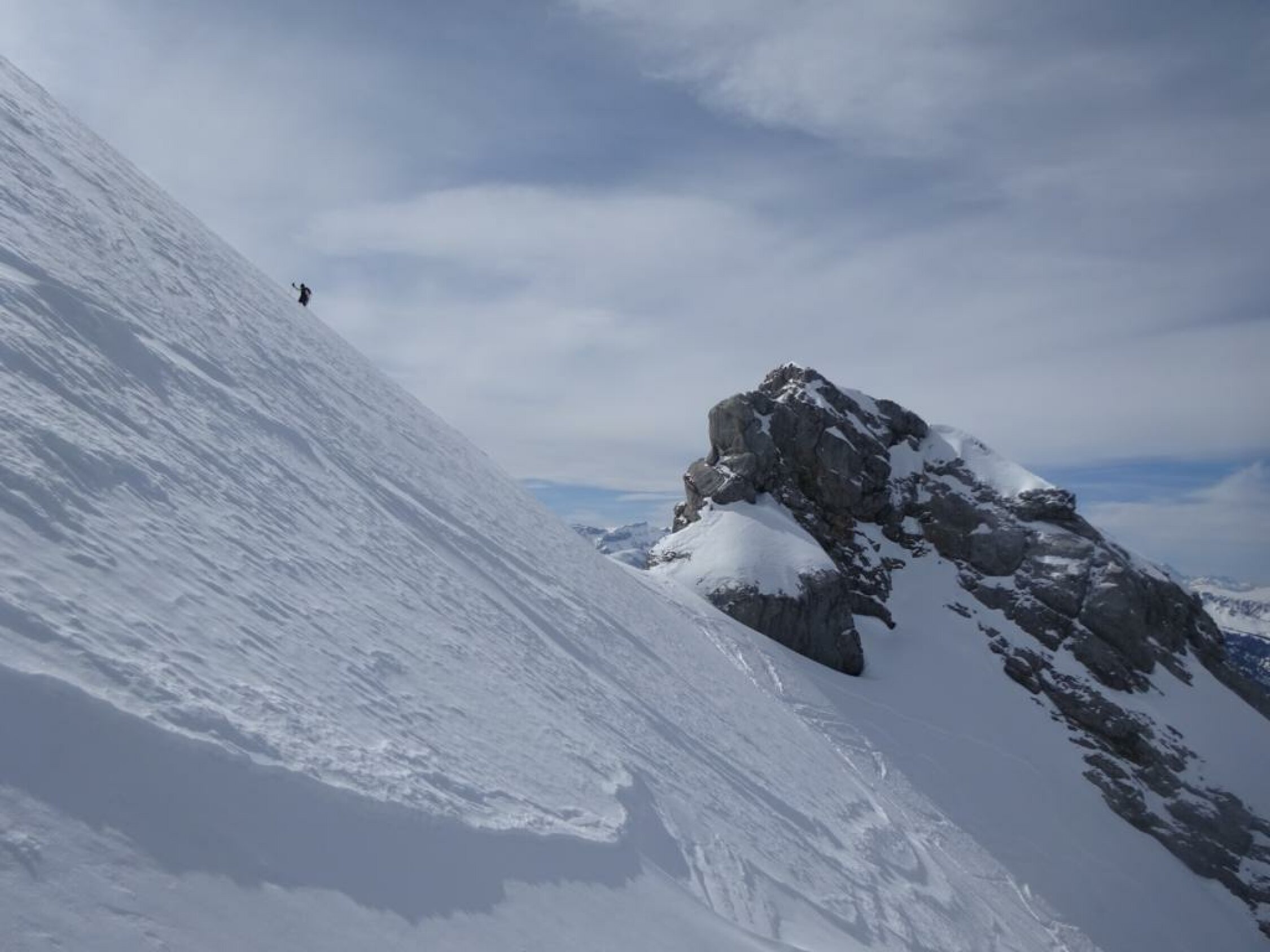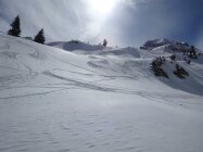 Schneeverhältnisse für April erstaunlich. Gipfel und Wildgrimmi bis fast zur Strasse Pulver gut, etwas schwer, darunter feuchter Schnee, auf der Strasse pistenähnlich. Auf der Strasse müssen die Ski mehrmals für ein paar Meter abgezogen werden. Die letzten ca. 10 Minuten der Strasse sind schneefrei.