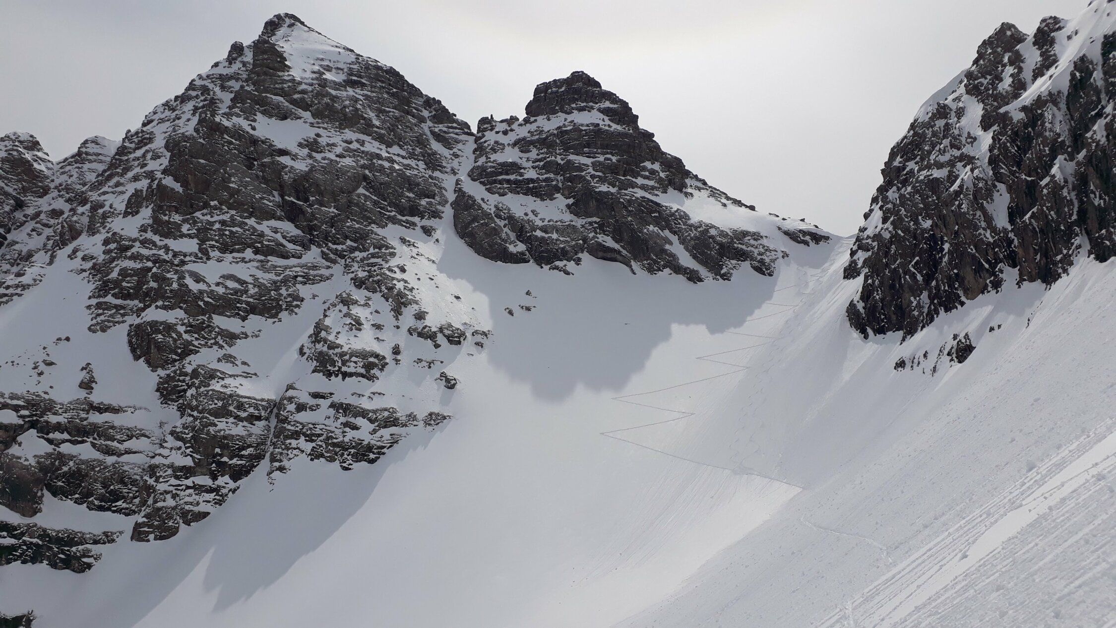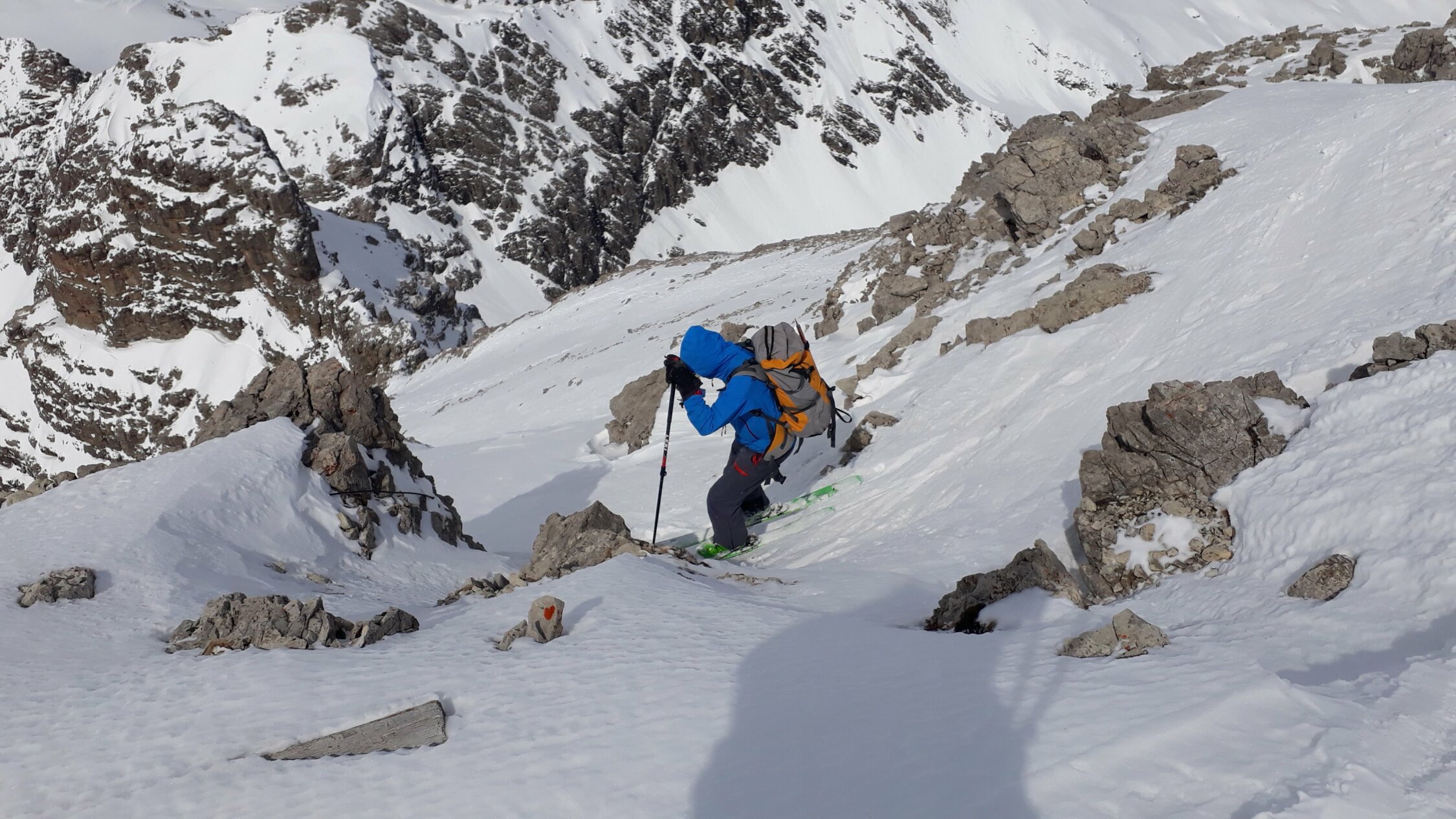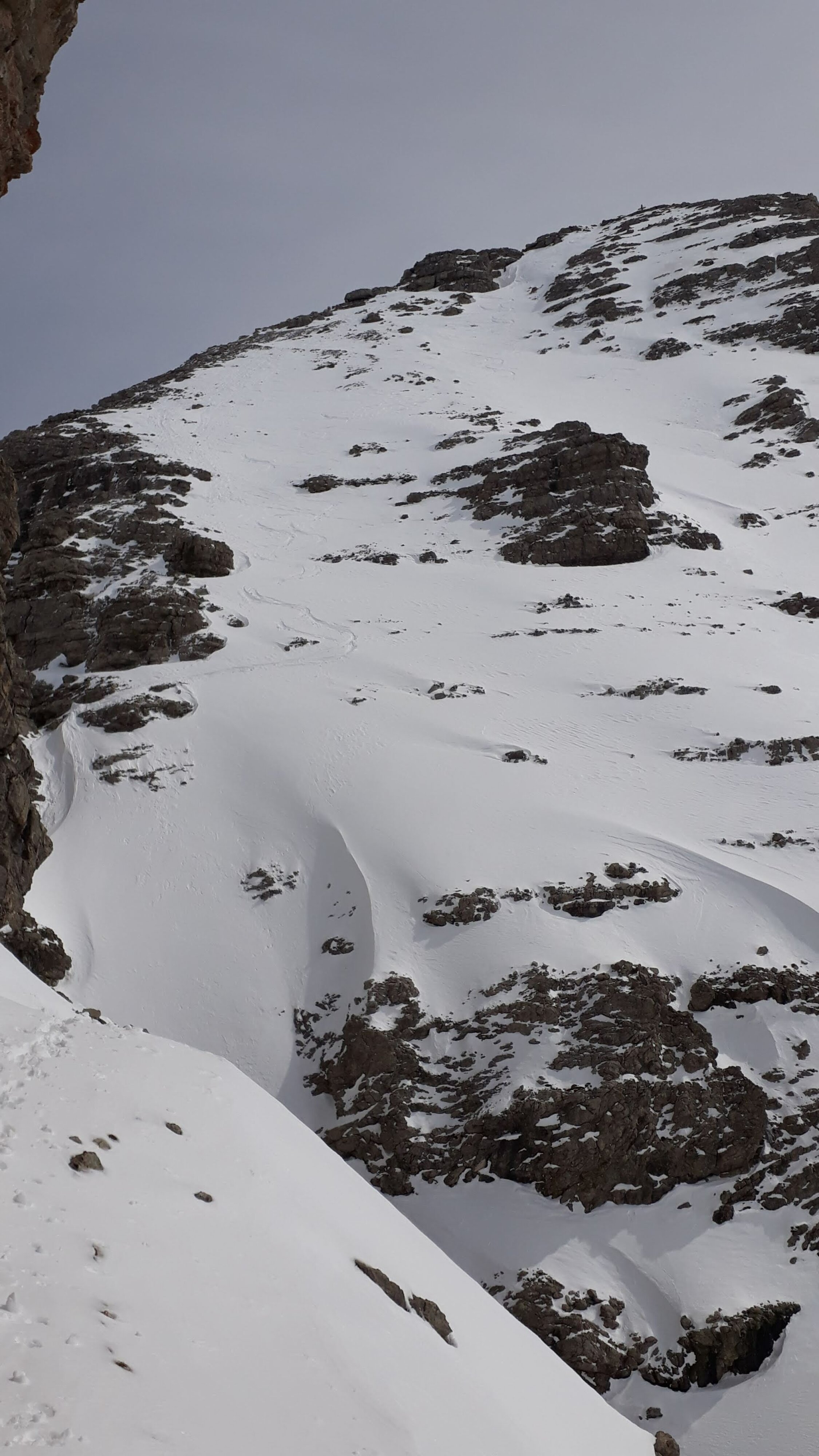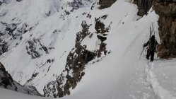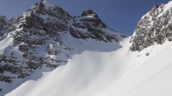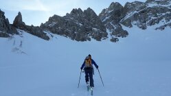 Um 8.00 am Prinz-Luitpold-Haus. Ohne die Spur vom Vortag vom Giebelhaus zum Prinz-Luitpold-Haus nicht als Tagestour möglich gewesen, da bis 1900 m extrem viel Schnee und äußerst mühsame Spurarbeit. Ab Prinz-Luitpold-Haus sehr unterschiedliche Schneemengen, nur in den Ostlagen (Kalter Winkel) sehr viel Schnee, ansonsten verblasen mit den unterschiedlichsten Schneequalitäten. Ab Balkenscharte sehr viel Schnee. Mühsame Querung und Aufstieg zur Kaltwinkelscharte. Mit Steigeisen zur Schulter hoch und spurlos teilweise heikel zum Gipfelaufbau traversiert. Hier noch ein Stück aus dem steilsten Teil hochgestiegen und wieder mit Skiern in Aufstiegsstellung bis kurz unter den Gipfel. Hier dann wieder zu Fuß bis zum Gipfel. Von der Kaltwinkelscharte bis zum Gipfel 1.5h benötigt! (normalerweise geht das schneller). Abfahrt vom Gipfel mit Skiern, in den kleinen Mulden Pulver, ansonsten Hartschnee mit vereisten Stellen. Von der Kaltwinkelscharte hinunter Pulverschnee, die Querung zur Balkenscharte wies bereits viele Oberflächenrutsche auf. Von Balkenscharte bis Prinz-Luitpold-Haus gut fahrbahrer Weichschnee, von da ins Tal grenzwertiger Nassschnee.