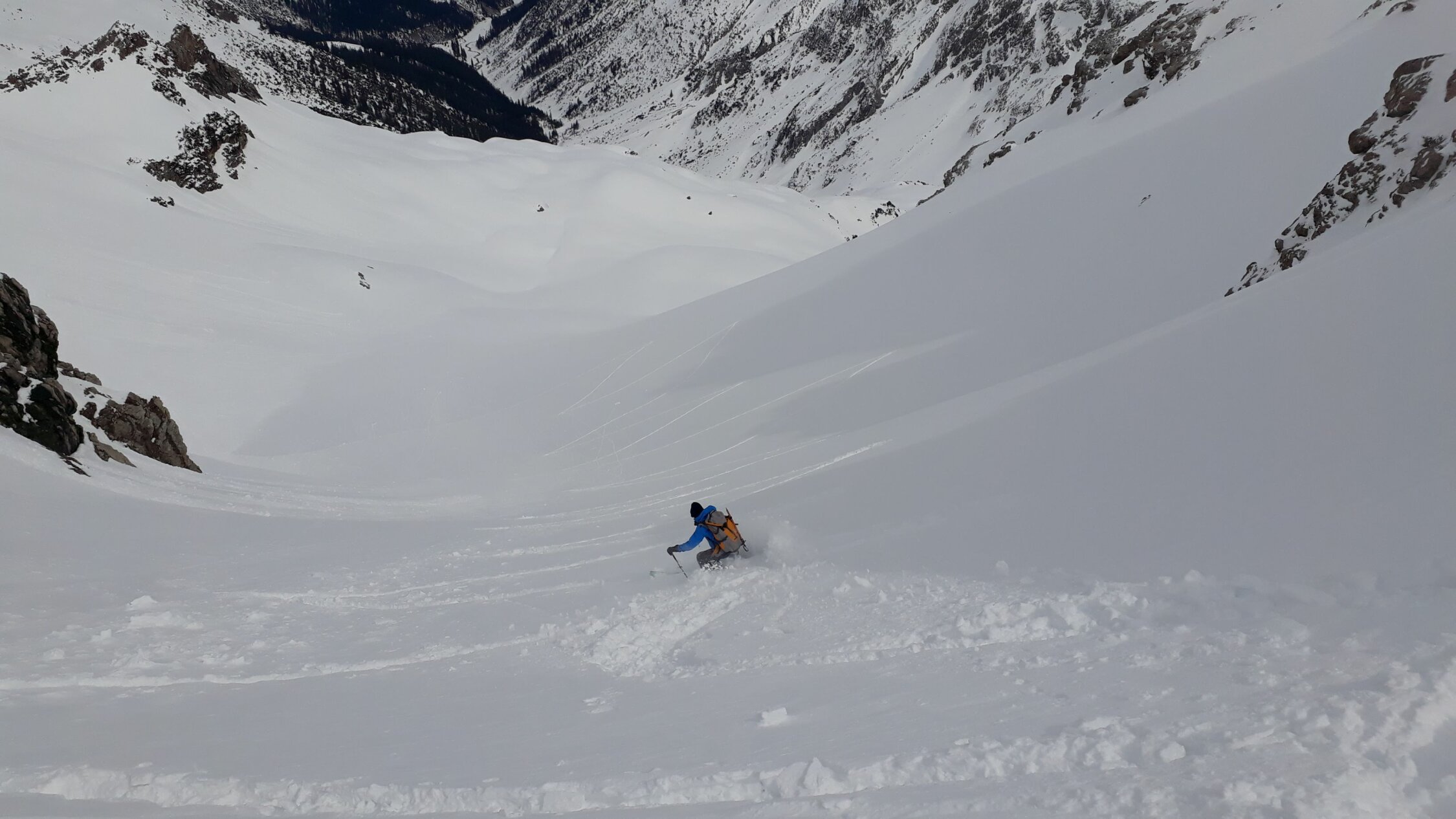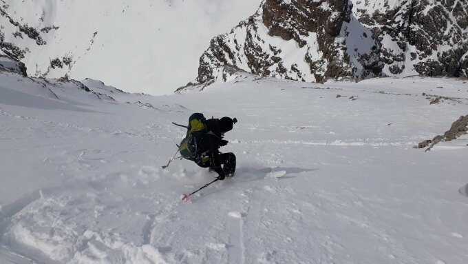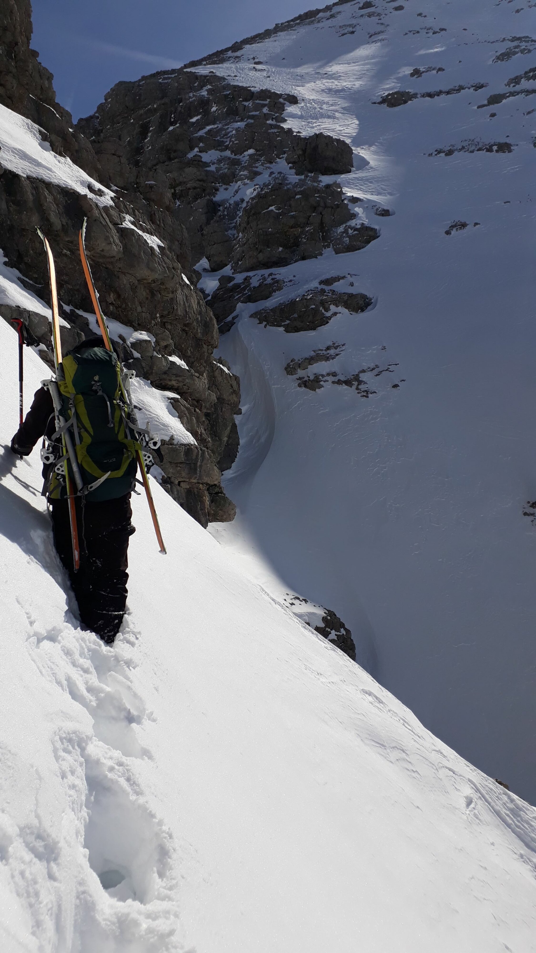 Um 8.00 am Prinz-Luitpold-Haus. Ohne die Spur vom Vortag vom Giebelhaus zum Prinz-Luitpold-Haus nicht als Tagestour möglich gewesen, da bis 1900 m extrem viel Schnee und äußerst mühsame Spurarbeit. Ab Prinz-Luitpold-Haus sehr unterschiedliche Schneemengen, nur in den Ostlagen (Kalter Winkel) sehr viel Schnee, ansonsten verblasen mit den unterschiedlichsten Schneequalitäten. Ab Balkenscharte sehr viel Schnee. Mühsame Querung und Aufstieg zur Kaltwinkelscharte. Mit Steigeisen zur Schulter hoch und spurlos teilweise heikel zum Gipfelaufbau traversiert. Hier noch ein Stück aus dem steilsten Teil hochgestiegen und wieder mit Skiern in Aufstiegsstellung bis kurz unter den Gipfel. Hier dann wieder zu Fuß bis zum Gipfel. Von der Kaltwinkelscharte bis zum Gipfel 1.5h benötigt! (normalerweise geht das schneller). Abfahrt vom Gipfel mit Skiern, in den kleinen Mulden Pulver, ansonsten Hartschnee mit vereisten Stellen. Von der Kaltwinkelscharte hinunter Pulverschnee, die Querung zur Balkenscharte wies bereits viele Oberflächenrutsche auf. Von Balkenscharte bis Prinz-Luitpold-Haus gut fahrbahrer Weichschnee, von da ins Tal grenzwertiger Nassschnee.