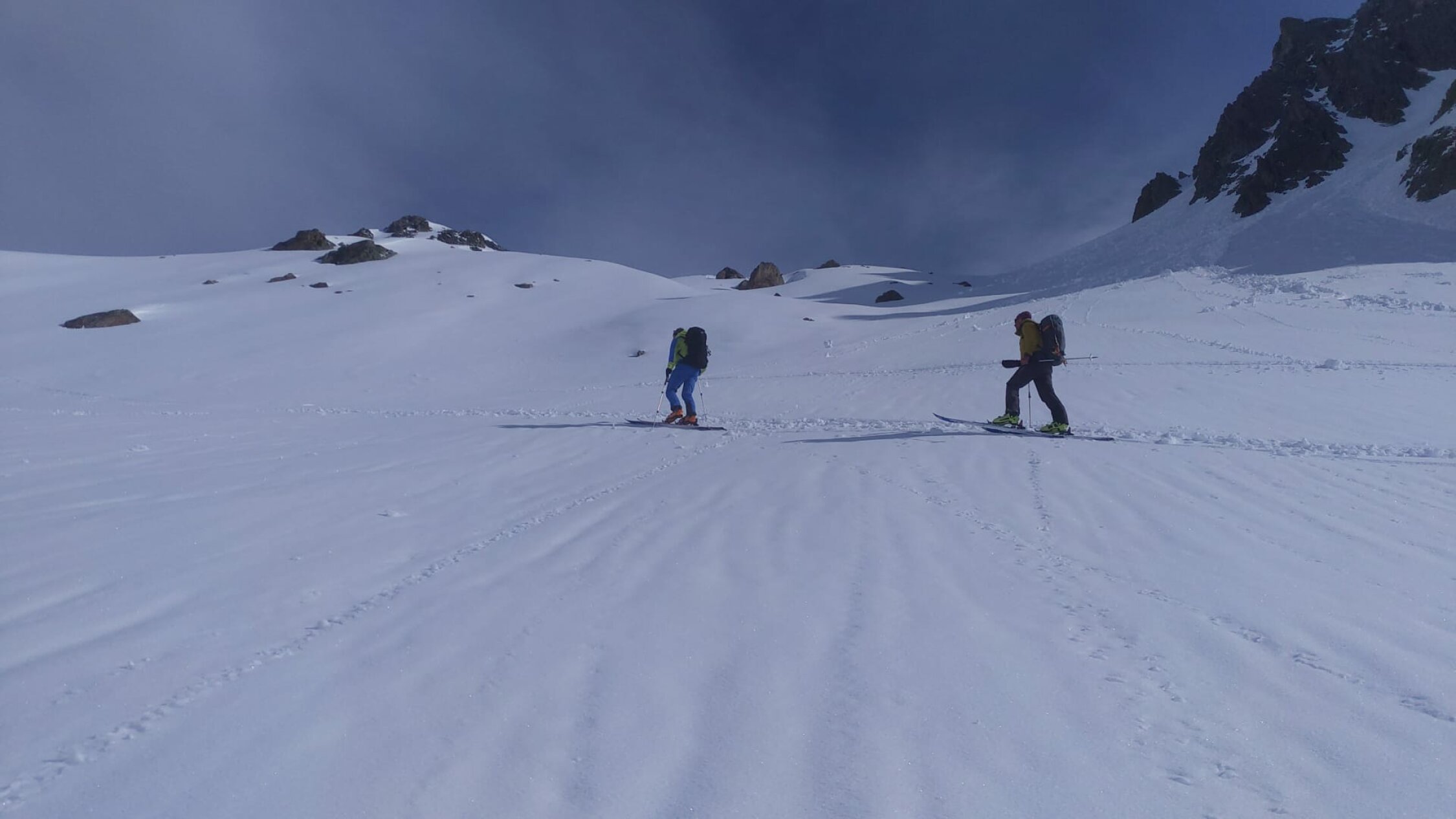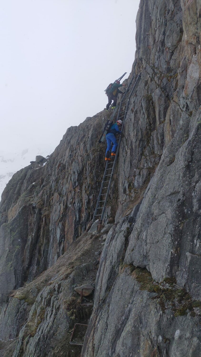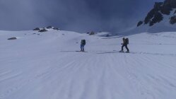 Abfahrt zur Triftbrücke ist gut machbar und es gab die ersten Pulverschwünge. Über Triftbrücke und Leiter runter und dann noch 50hm am Schutthügel abgefahren. Aufgefellt und ohne Harscheisen bis zum Gipfel aufgestiegen. Gegen oben immer mehr frischen Schnee und dann bald die Sonne. Wir sind bis zum Wintergipfel 2795, drei Frauen sind auf den Hauptgipfel 2818 aufgestiegen.