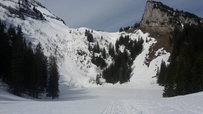 Bei Alplen kam mir eine grössere Gruppe entgegen. Der Steilhang unterm Butzen musste schon massiv Schnee lassen. Der Rest besteht aus zusammengerutschten Runsen. In Waldnähe lässt sich dieser aber ganz gut ersteigen und befahren. Bis zur Stockalp dann eher feuchter Schnee. Ab da wurde aufgrund der NW-Ausrichtung der Schnee fester. Nach der langen ansteigenden Traverse montierte ich vorsorglich die Harscheisen. Im steilen und falls hartem Gipfelhang wäre das nur bedingt möglich. Der Übergang zum Gipfelhang war heute gutartig. Bei wenig Schnee kann das hier schnell mal heikel sein. Die Gruppe vor mir(?) hatte in den Gipfelhang eine ausgezeichnete Spur gelegt. Danke an dieser Stelle. Mit den Harscheisen war ich trotzdem gut bedient.