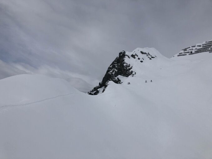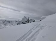 Noch genügend Schnee in Zürs, beim Aufstieg noch sehr hart, bei der Abfahrt gegen Mittag schon sulzig. Sicht gestern sehr schlecht