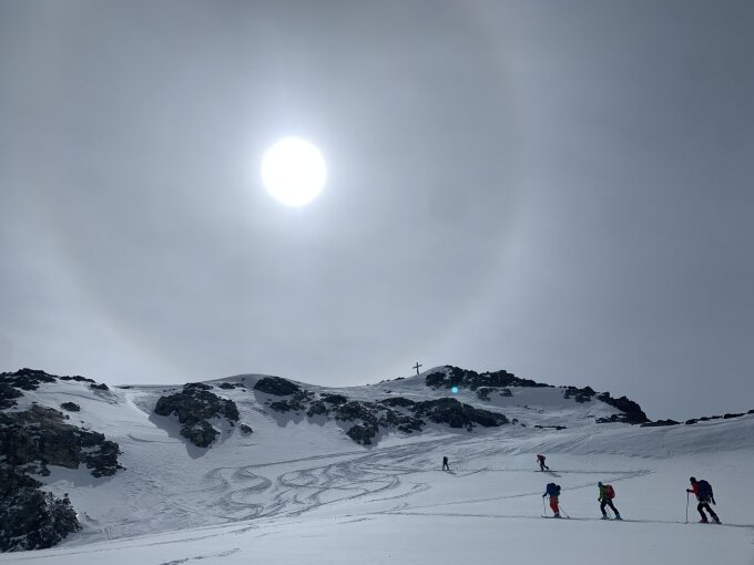 Ganze Tour ab Tuoi Hütte eingeschneit. Keine Gletscherspalten gesichtet. Der Schnee teils weicher Triebschnee und sonst meist Sulz.