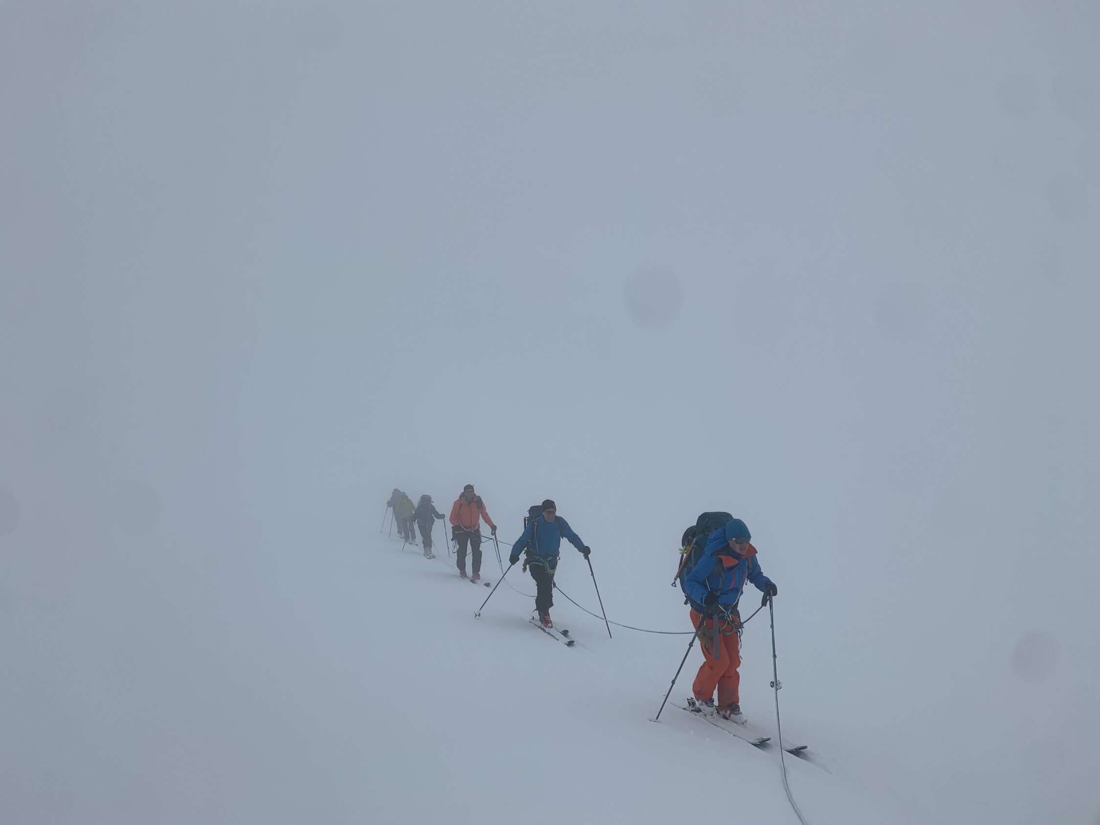 Die Sicht Verhältnisse oben am Silvrettagletscher waren " Whiteout" wir haben deswegen trotz geringer Spaltenerwartung angeseilt und auf den Gipfel verzichtet.