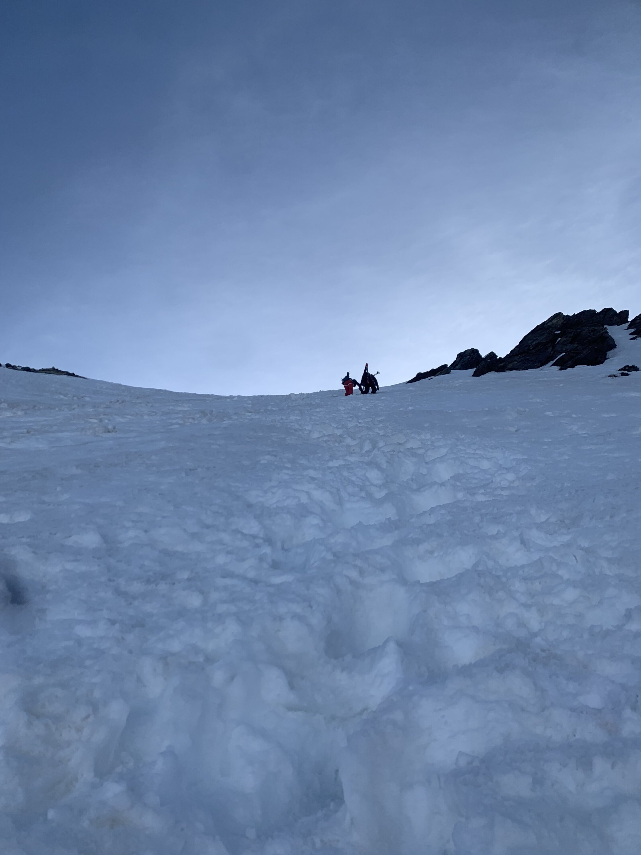 Rauf in den Col de Mont Brulé hat es gute Tritte im Firn. wir sind mit Steigeisen hoch. Einige auch ohne.