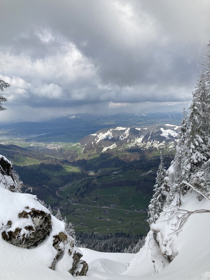 Querung in die Nordflanke etwas unangenehm. Vereiste Unterlage mit schlecht gebundenem Topping. Steilhang dann ähnlich wie am Gross Aubrig. Neuschnee ging beim Schwingen ab. Er ist jetzt unten...