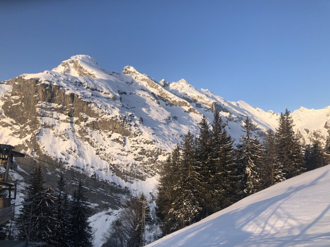 Abfahrt: Im oberen Teil exzellent (Abfahrt um 10 Uhr), unten dann spürt man halt die harte Unterlage, aber insgesamt immer noch sehr gut. Die Abfahrt ist aktuell bis auf etwa 1100m möglich, danach Portage zurück zur Talstation gute halbe Stunde. Alternativ auf das Bähnli warten (reduzierter Fahrplan!).