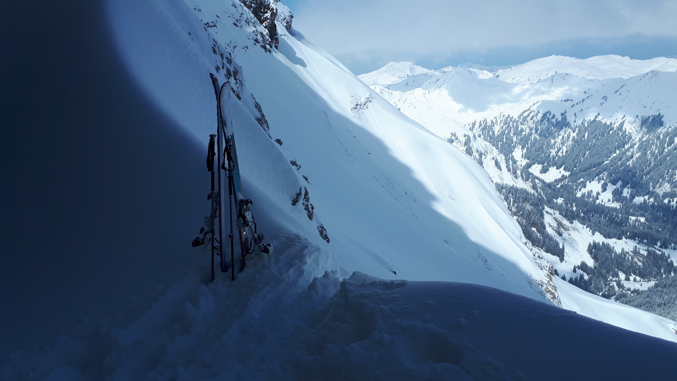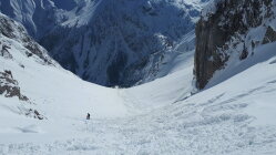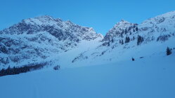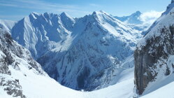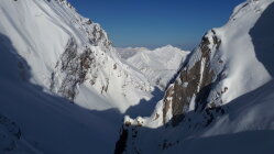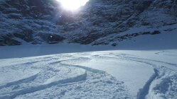 Im Tal wenige cm Neuschnee, oben ca 20 cm. Aufstieg Gemsteltal, überschneite Spur vom Vortag, zwei mal Abfahrt nach Osten, einmal Aufstieg unter die Felsen am Widderstein und Abfahrt nach Norden. Also dreimal Aufstieg im Gemsteltal. Summe 2200 Hm. Ostseitig bei der ersten Abfahrt um 8:30 Uhr schwerer Pulver, bei der zweiten um 10 Uhr nochmal etwas schwerer. Nordseitig noch lockerer. Bis zur letzten Abfahrt um 12:15 Uhr waren beide Seiten schon gut zerfahren. Schon morgens ab 8:15 Lockerschneelawinen aus den felsigen Hängen von Widderstein und kleinem Widderstein. der Neuschnee kam auf einer harten Schicht zu liegen, die zum Teil etwas verbollt war, was den Fahrgenuß an einigen Stellen leider etwas beeinträchtigt hat. Im unteren Teil war die Schneequalität naturgemäß mäßig.