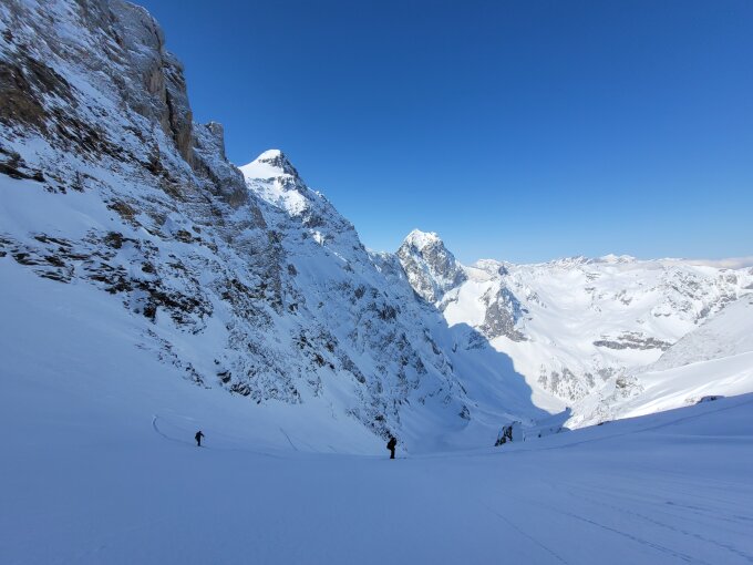 Abfahrt dann wunderbar, vor allem die oberen 2/3 der Ruchenchälen. Allerdings aufgepasst vor Abgängen von der sonnenbeschienen Sattelhorenseite!