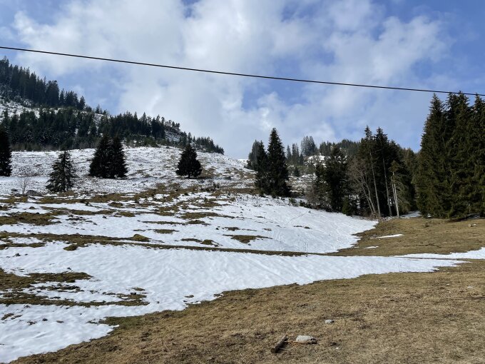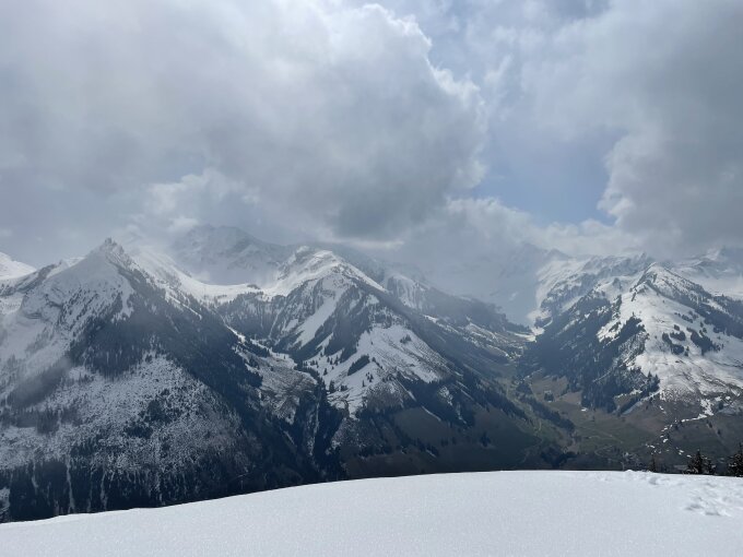 Schnee im ersten Hang knapp, aber der Strasse nach momentan nur zwei kurze Tragestrecken. Danach genügend bis viel Schnee, speziell wenn man bedenkt, dass bereits Mitte April ist. Schöner Aufstieg, sehr wenig verspurt. Wetter wechselhaft, aber ich hatte Glück und immer gute Sicht und meist Sonne. Im Gipfelhang knapp 10 cm flauschiger Pulver auf guter Unterlage. Das war so schön, dass ich diesen Hang dreimal abfuhr und aufstieg. Dazwischen am Gipfel ein kurzer Schwatz mit 2 anderen Tourengängern, mehr Leute hatte es nicht. Abfahrt auch weiter grandios, gegen unten von Pulver nahtlos in Firn wechselnd. Dank der Strasse in letzten Hang noch fahrbar bis fast zum PP.