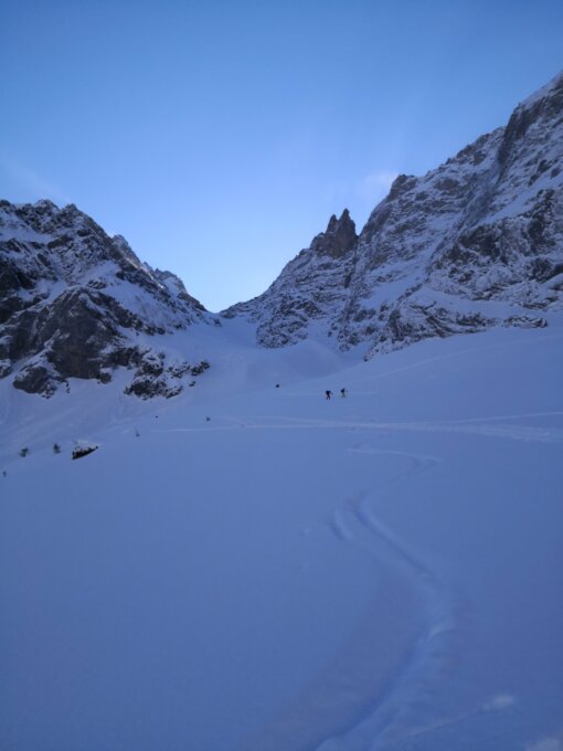 Besser gehts nicht mehr, um 07.15 bei der Brücke gestartet bei - 2°C, angenehm, zuerst ohne Ski bis kurz vor Sittlisalpbahn.Nach knapp 1.25h Einstieg gut aufgewärmt in die Ruchchälen abgebogen. Eine sehr gute Spur war vorhanden in schönem Pulver. Vielen Dank dem Spurer. Zu Beginn bereits Wind gegen oben hin immer stärker, recht kalt in der dunklen Chälen. Nach knapp 3.25h am Pass, ging sehr gut. Danach nur noch Willenssache bis, Skidepot. Steigeisen, Pickel für Aufstieg zu empfehlen, ginge heute auch ohne. Nach 5.5h am Gipfel, leider Wolken welche den Tiiiiefblick verdeckten. Abfahrt dann in ca. 30min bis Brunnialp, perfekter Powder, zum Teil knietief bis ca. Mitte der Chälen. Anschl. Laaaanges Auslaufen der Strasse entlang, 2-3x müssen Ski kurz abgezogen werden.