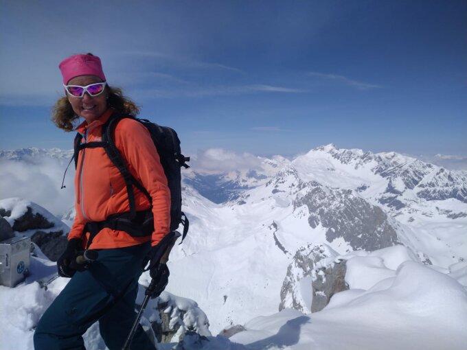 Bei wunderschönem Wetter und ausgezeichneten Verhältnissen zum Einstieg in die Blodigrinne. Pulver wie mitten im Winter in der Blodigrinne wie es selten der Fall ist (Pulver hat es ja oft aber dass die Verhältnisse mit der Lawinensituation so gut passt ist was anderes). Durchstieg zum Blodigsattel kurzes Stück die Ski tragen und dann weiter mit den Skiern bis komplett zum Gipfel. Harscheisen teilweise von Vorteil.