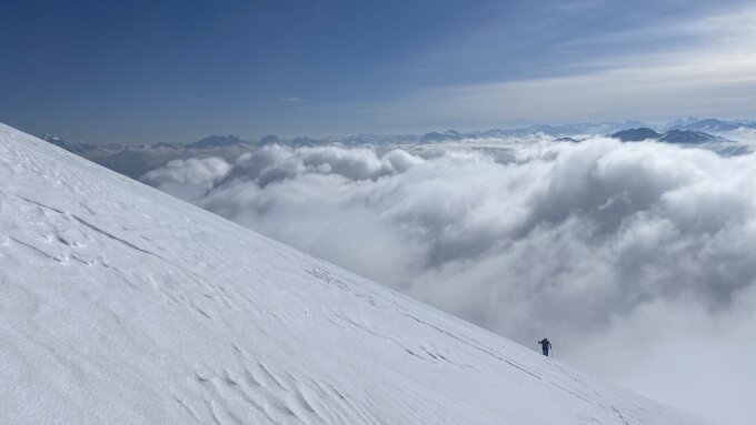 Übergang vom Skidepot zum Gipfel mit viel Neuschnee, ist aber problemlos.