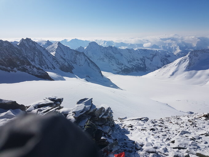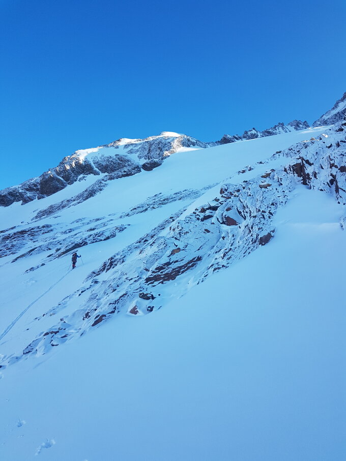 Gute Bedingungen im Gebiet und am Finsteraarhorn. Gletscher gut eingeschneit.