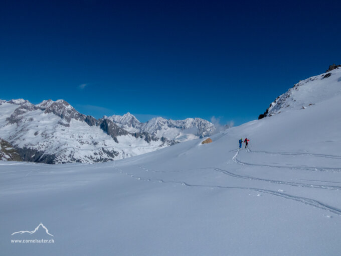 Dann Fussaufstieg, anfangs beim Couloir links haltend auf dem Blockgelände geblieben, später teils harter Schnee, Pickel, Steigeisen.