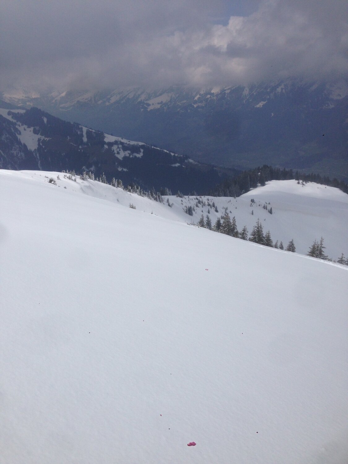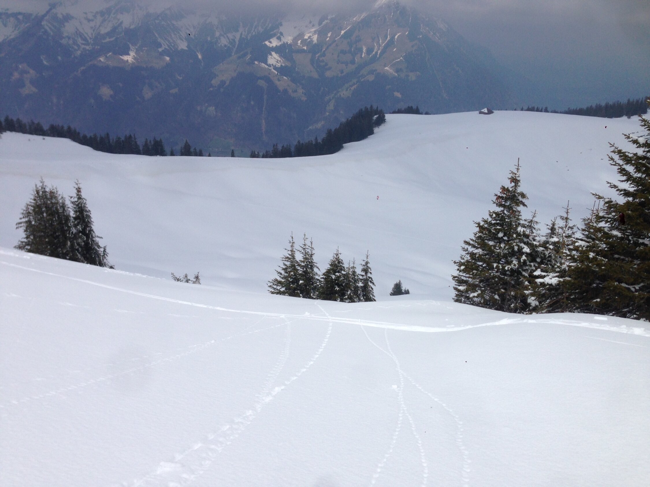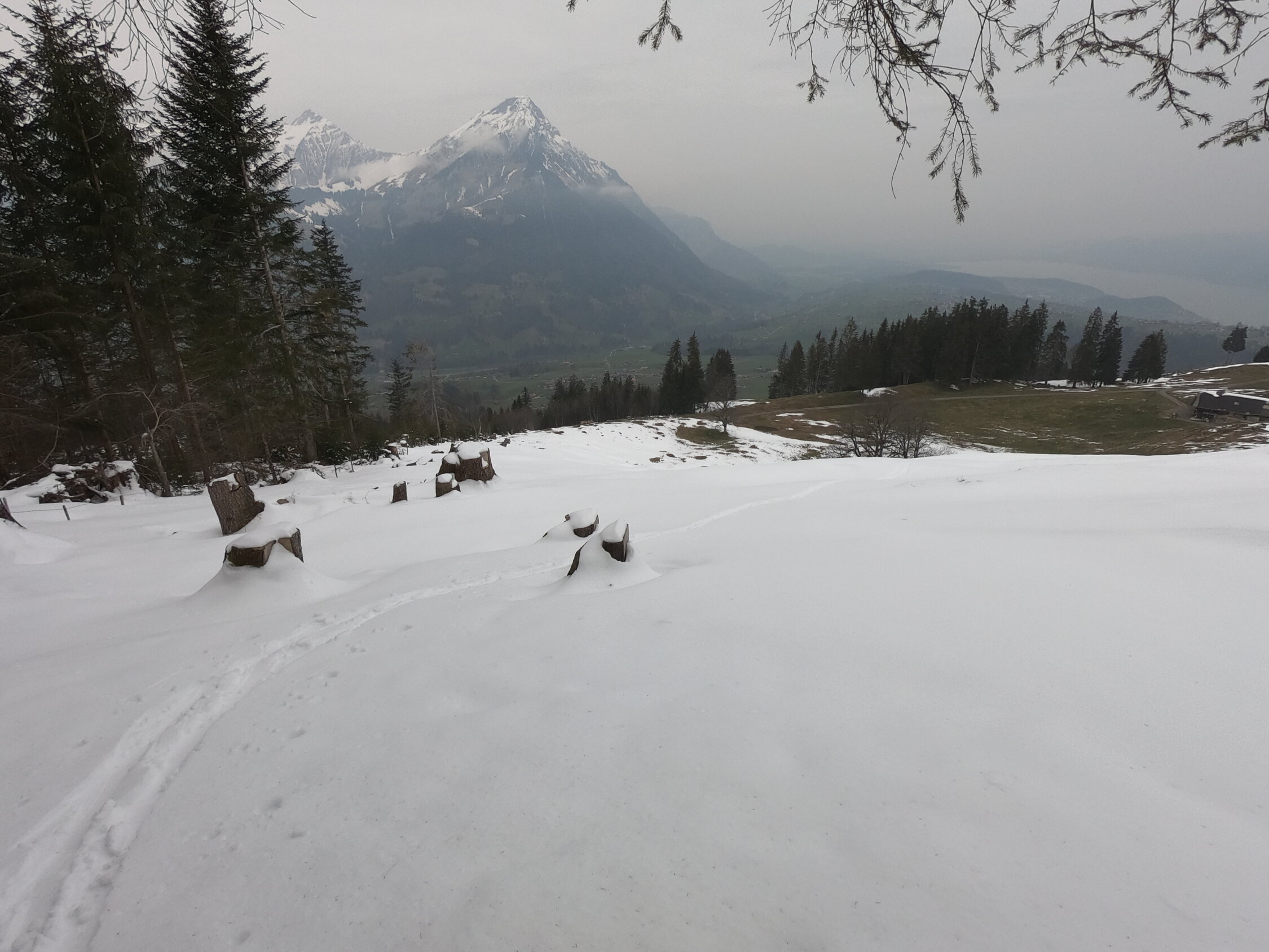 Tragstrecken ab Geissboden werden mehr. Viele Stellen waren nur noch mit relativ neuem Schnee gedeckt und sind schnell wieder aper. Geissboden nicht befahrbar weil noch ca ein halben Meter Schnee liegt auf ganzem Platz.Ab Forsthaus noch viel Schnee