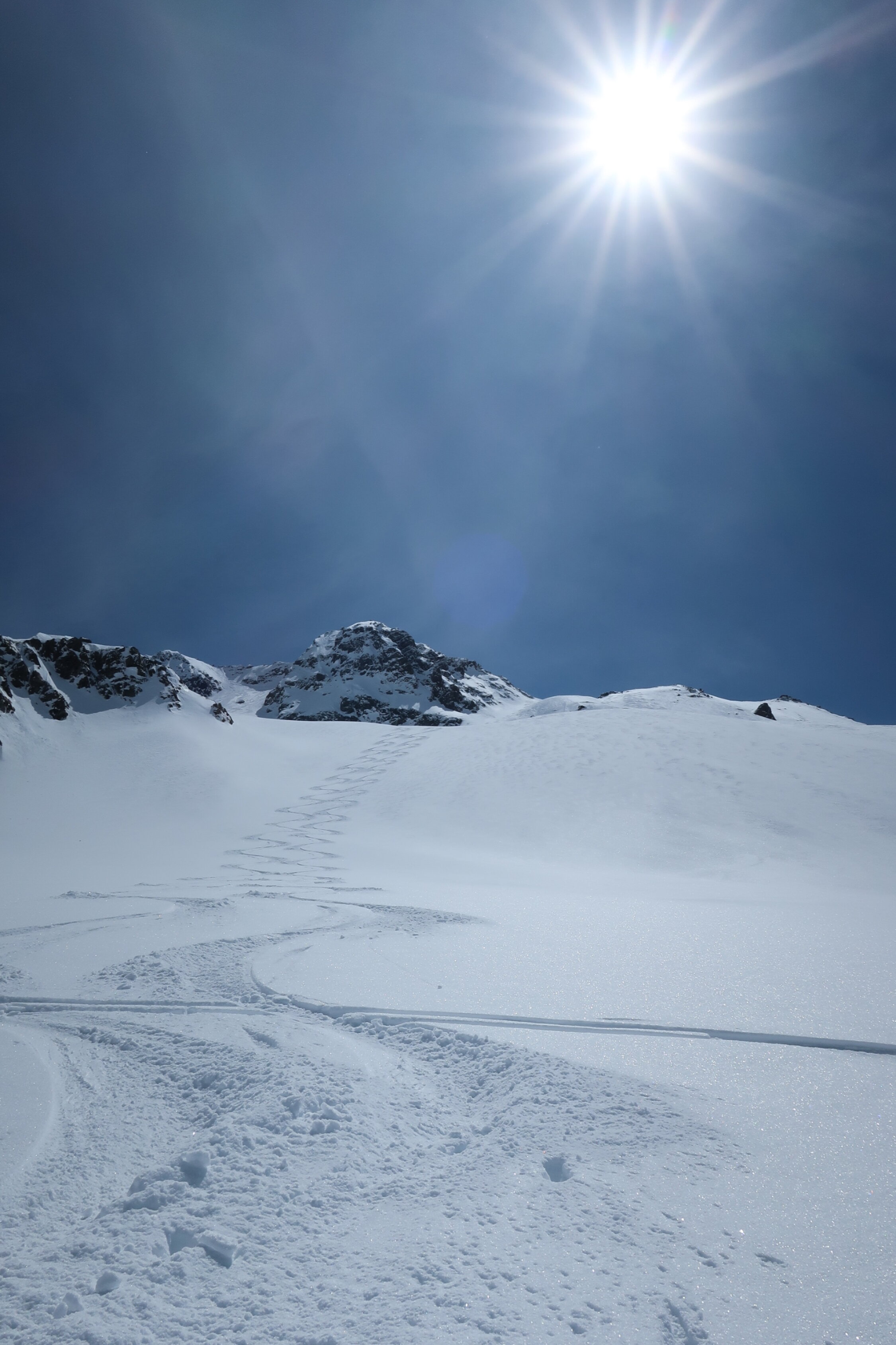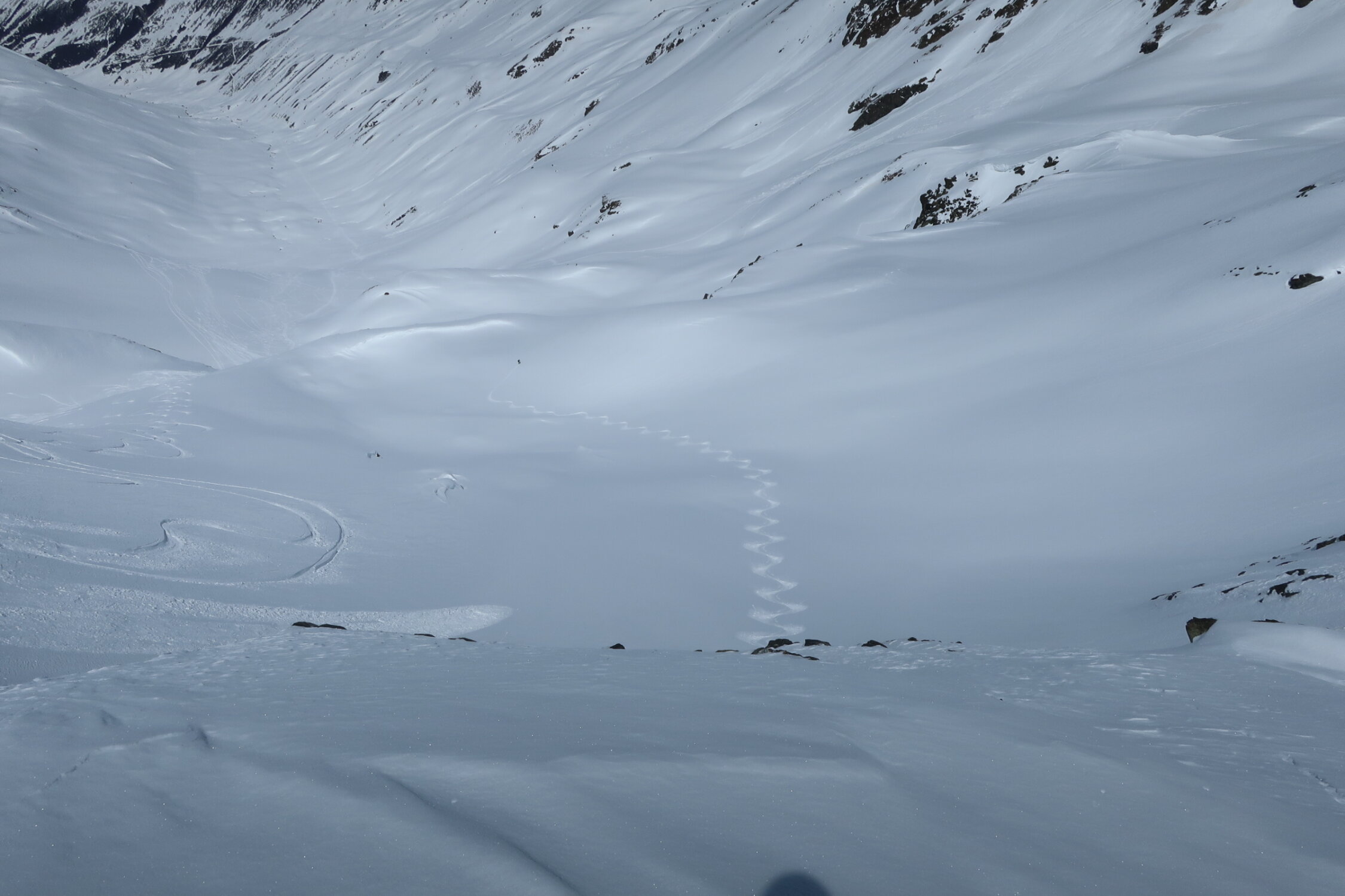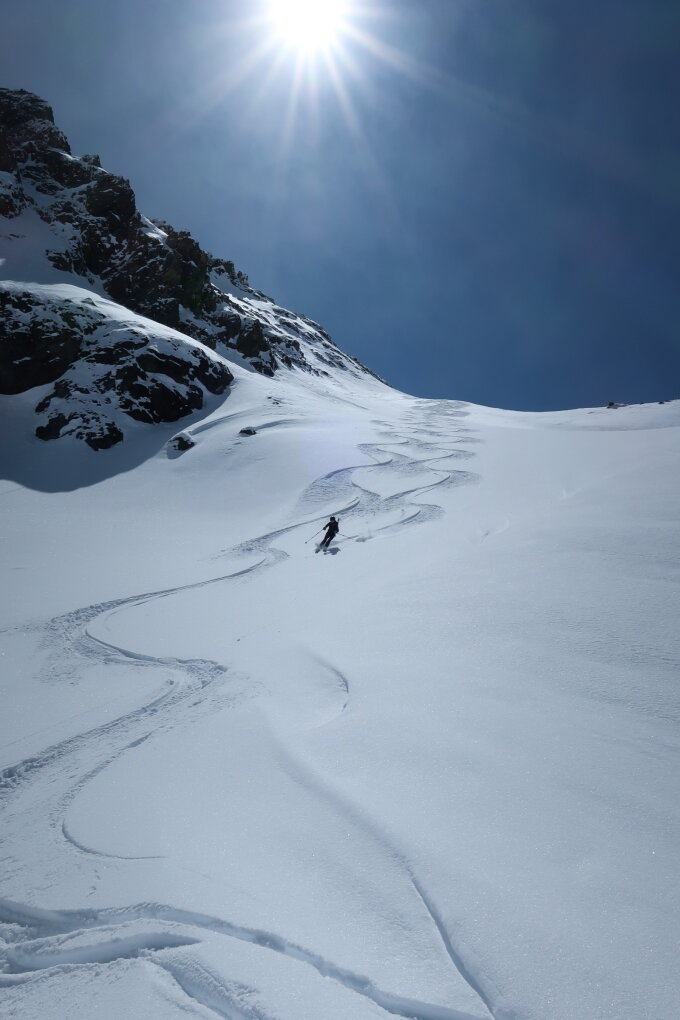Abfahrt dann durch die Nordhänge in super Powder! Wahnsinn für Mitte April!