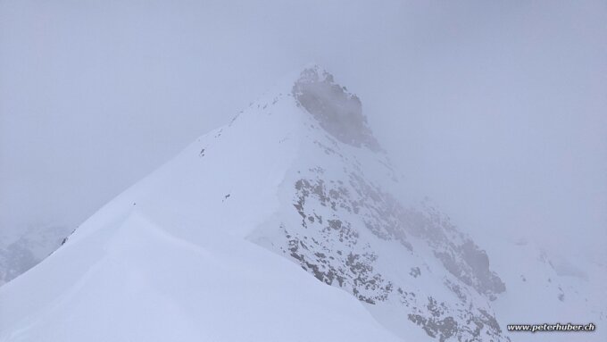 In der Nacht hat es ca. 3 cm Neuschnee gegeben. Gute Spur bis auf die Schulter des Piz Tasna. Dann mit gutem Trittschnee auf den Gipfel. Leider ziemlich neblig.