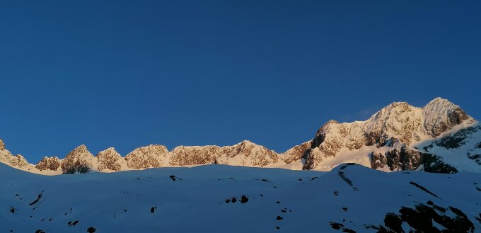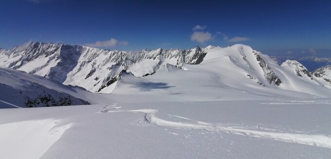 Ab Abfrutt bis zur Voralpkurfe ist die Strasse nun geräumt aber noch geschlossen. Auf dem Bergweg werden die Tragestellen schnell länger. Am Morgen Hartschnee bis ca. Hüttenhöhe, dann zunehmend Pulverschnee von der letzten Nacht bis zur Lücke. Bei der Abfahrt zur Hütte um 11 Uhr wurde der Schnee unterhalb von 2700 feucht.