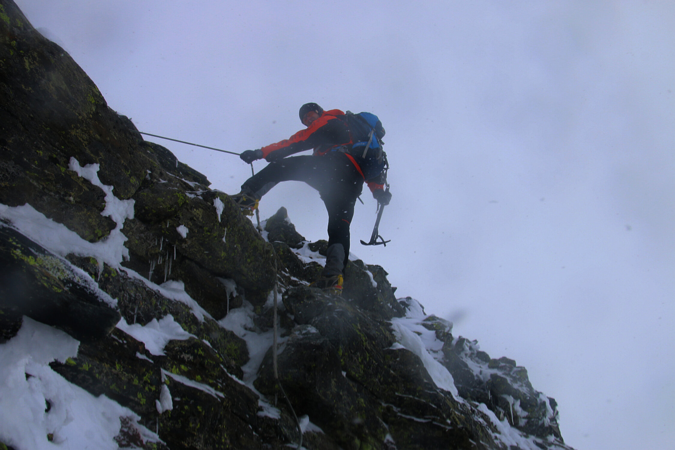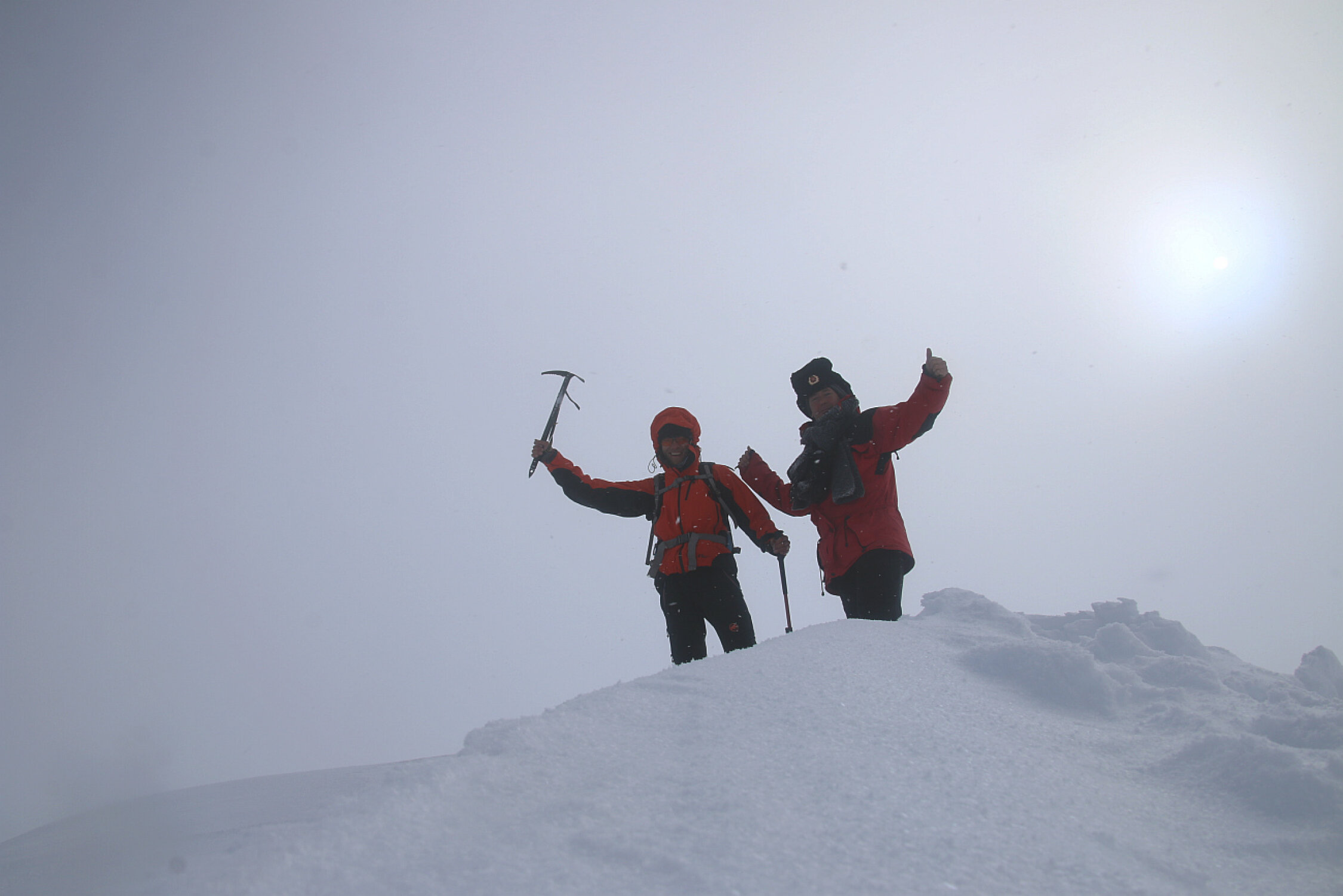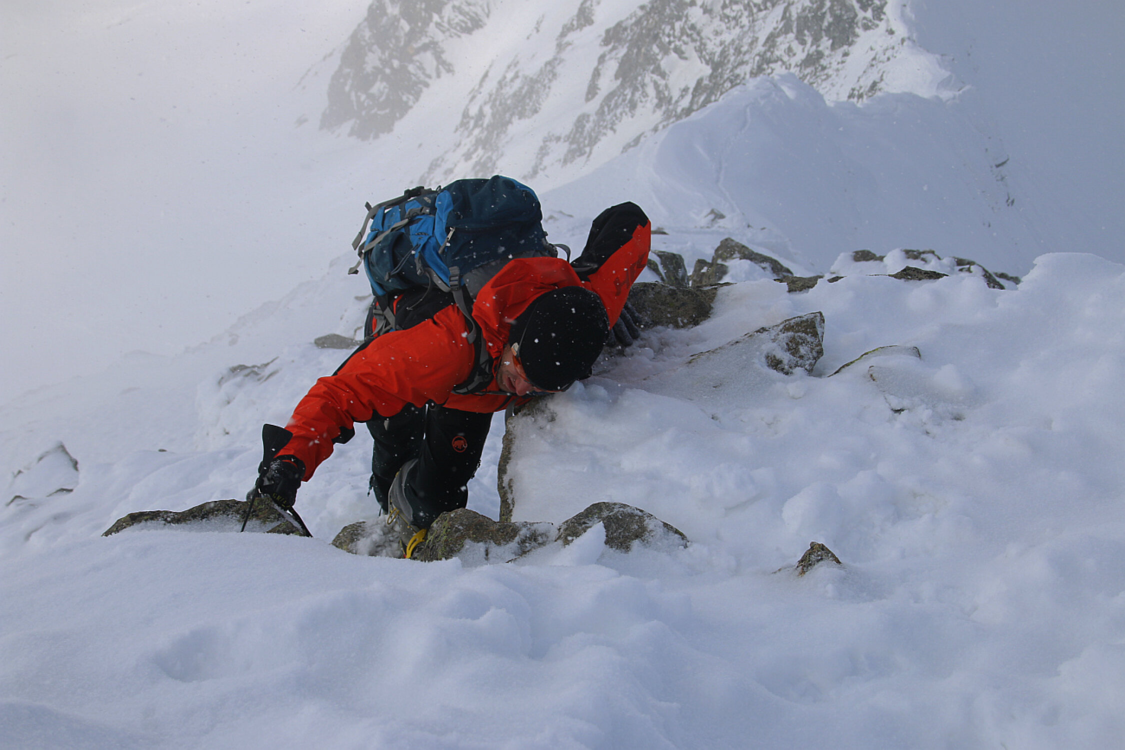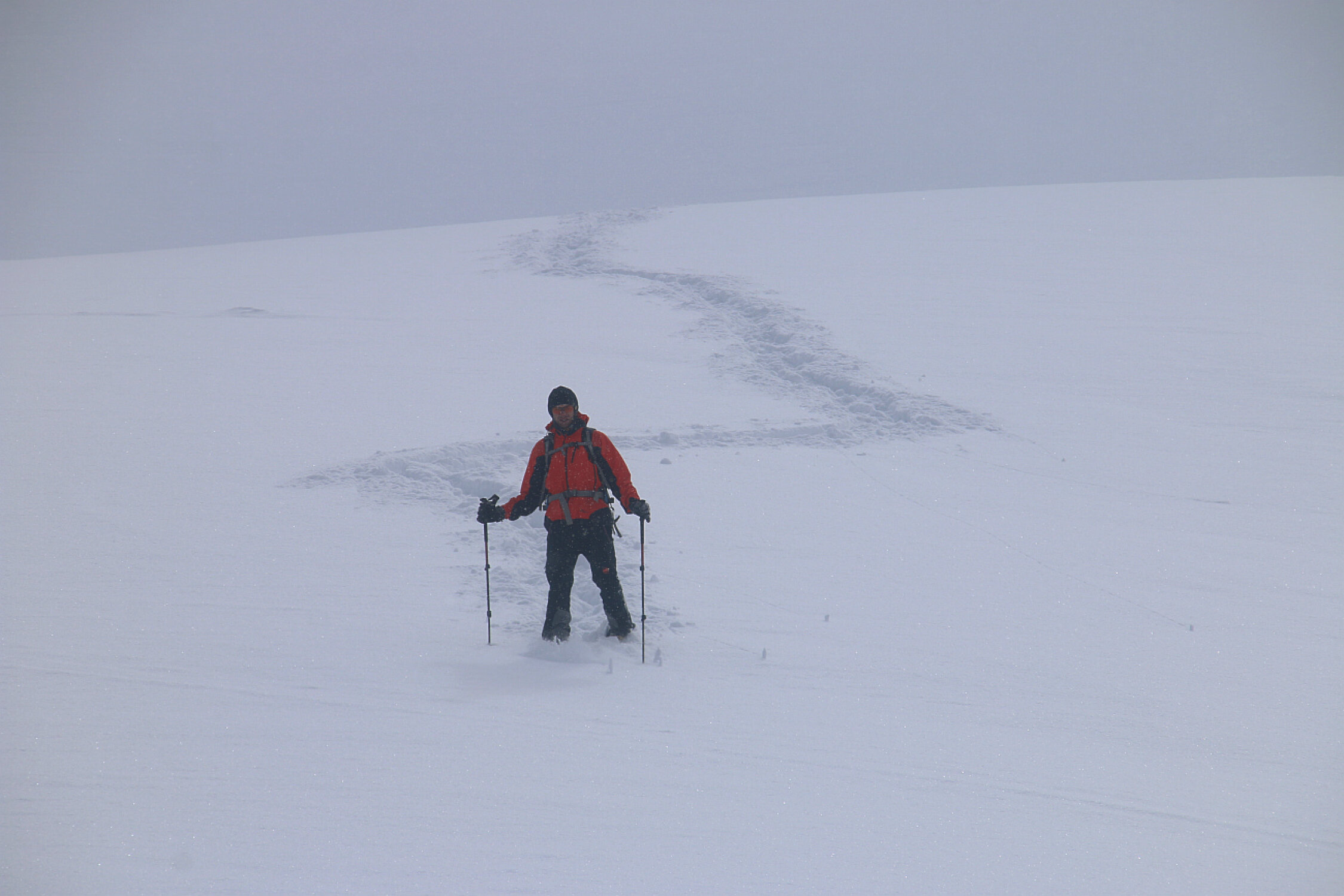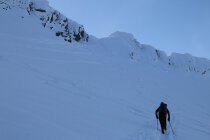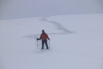 Leider war das Wetter nicht ganz so gut am Sonntagmorgen als wir um 5 Uhr die Hütte verliessen. Es schneite leicht und der Himmel war zugezogen. Zunächst stiegen wir im Licht der Stirnlampe in östliche Richtung auf. Auf zirka 2500m wurde es langsam hell und wir rasteten ein erstes Mal währen sich nun das Bortelhorn mit einer den Gipfel verhüllenden Wolke zeigte. Etwas weiter oben änderten wir die Richtung nach Südost und trafen bald darauf auf eine gute Spur über den tief eingeschneiten Bortelgletscher hinauf zum Südwestgrat. Irgendwann war der Schnee aber auch in der Spur zu tief und ich zog nach einer kurzen Trinkpause die Schneeschuhe an während Daniel ohne weiter ging. Manchmal lichteten sich nun die Wolken und wir konnten die umliegenden Berge bestaunen. Doch wurde es nun auch immer kälter je weiter wir hinaufwanderten. Im Gratsattel bei P.2986m angekommen blies uns zudem ein eisiger Wind entgegen. Die deponierten wir unsere Schneeschuhe und zogen die Steigeisen an. Der Grat machte mir schon von unten her gesehen Spass. Es war eine Spur vorhanden die aber oft zugeweht war. Wir gewannen rasch am Höhe und mussten nur an wenigen Stellen für einige Züge etwas klettern. Am Gratende trafen wir auf ein Fixseil bei einer etwas mühsamen Stelle mit abwärtsgerichteten Platten. Die aus dem Schnee ragende Spitze des Kreuzes am Vorgipfel liessen wir links liegen und traversierten nun nahezu waagrecht hinüber zum höchsten Punkt. Aussicht hatten wir in den Wolken leider keine und es war mit -13°C zusammen mit den Böen echt frostig dort oben. Der Abstieg über den Grat meisterten wir problemlos und auch der weitere Abstieg zu den Hütten war mit den Schneeschuhen ein schnelles hinuntersurfen! Auf der Hütte machten wir nochmals eine Stunde Pause bevor es nun ohne Schneeschuhe zurück zum Ausgangspunkt ging wo wir dogleich einen Bus erwischten.