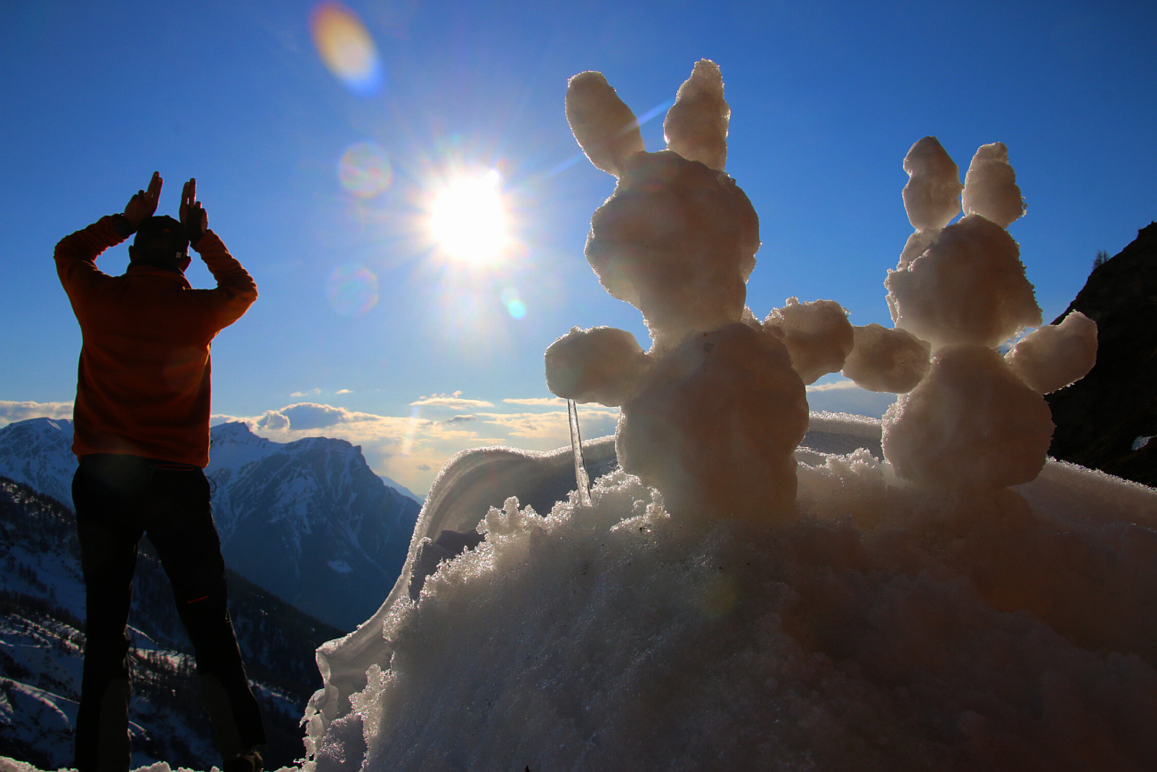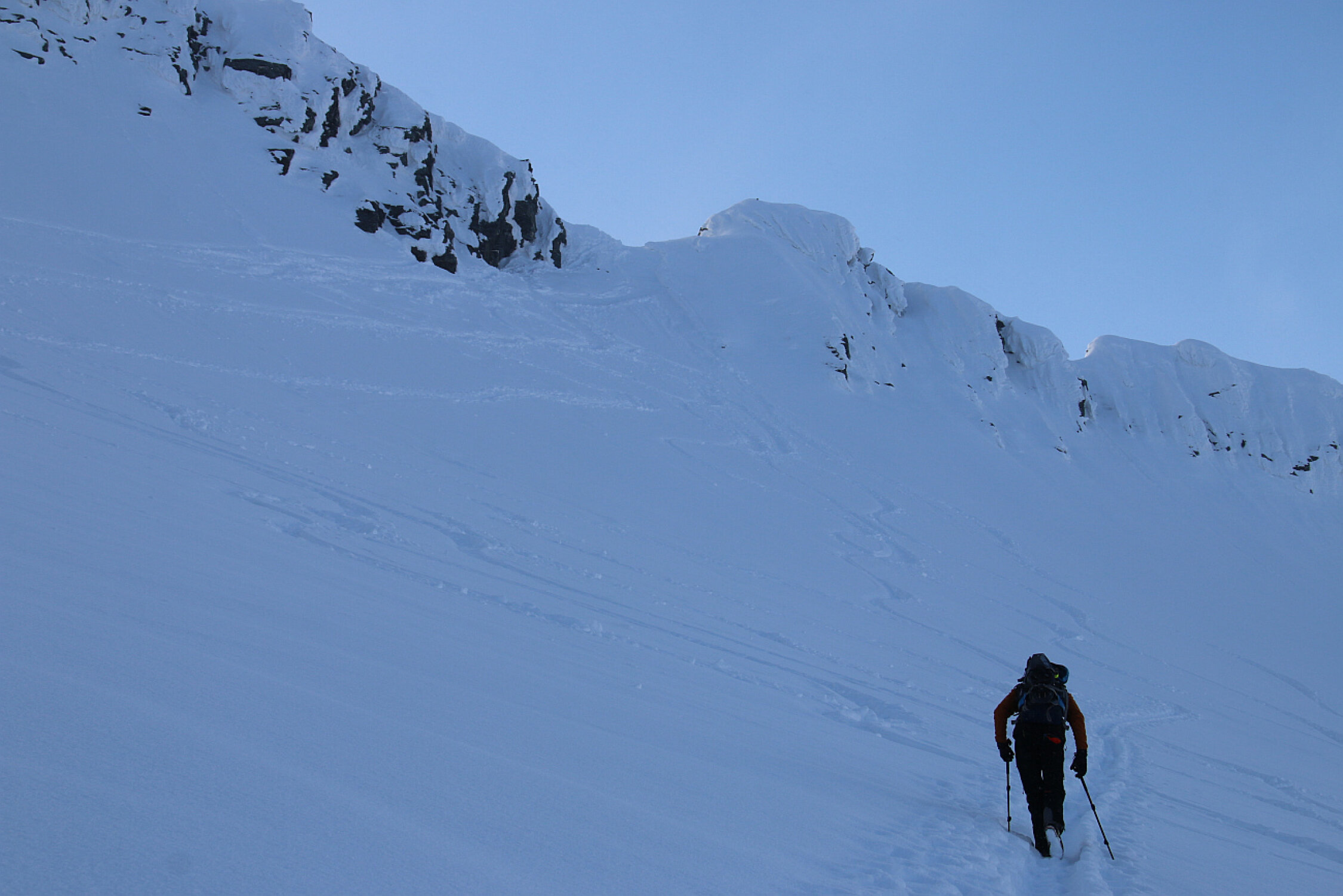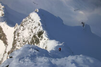 Optimale Bedingungen am Grat und auch für Ski oberhalb der Bortelhütten. Steilstufe zur Hütte hinauf ist grösstenteils aper.