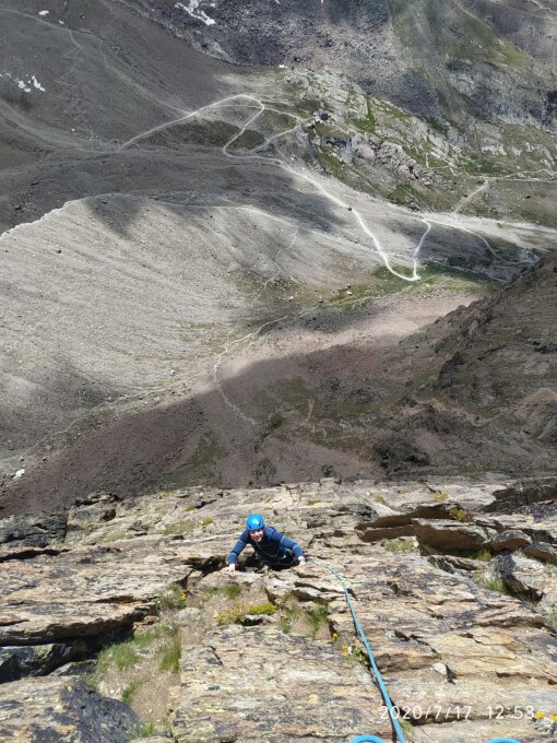 Great route. There are few routes like this at this level. All pitches feel like 4b/4c. The route is easy to find. My partner and I swapped leads. We did no simul-climbing, we were just enjoying a beautiful day. No falls. Took the normal route down, I did this on sneakers which is fine as long as there are good, dry conditions. We took the cable car up and down from Kreuzboden.