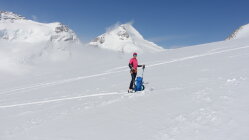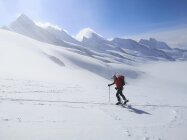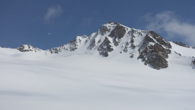 Von Mönchsnoch über das Ewigschneefeld durch etwas Neuschnee abgefahren. Aufstieg durch SE-Hang im unteren Drittel etwas harschig, danach lockere Schneeauflage. Zuletzt über lockere Steine unschwer zum abgeblasenen Gipfel.