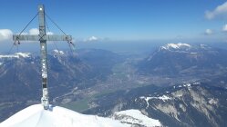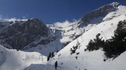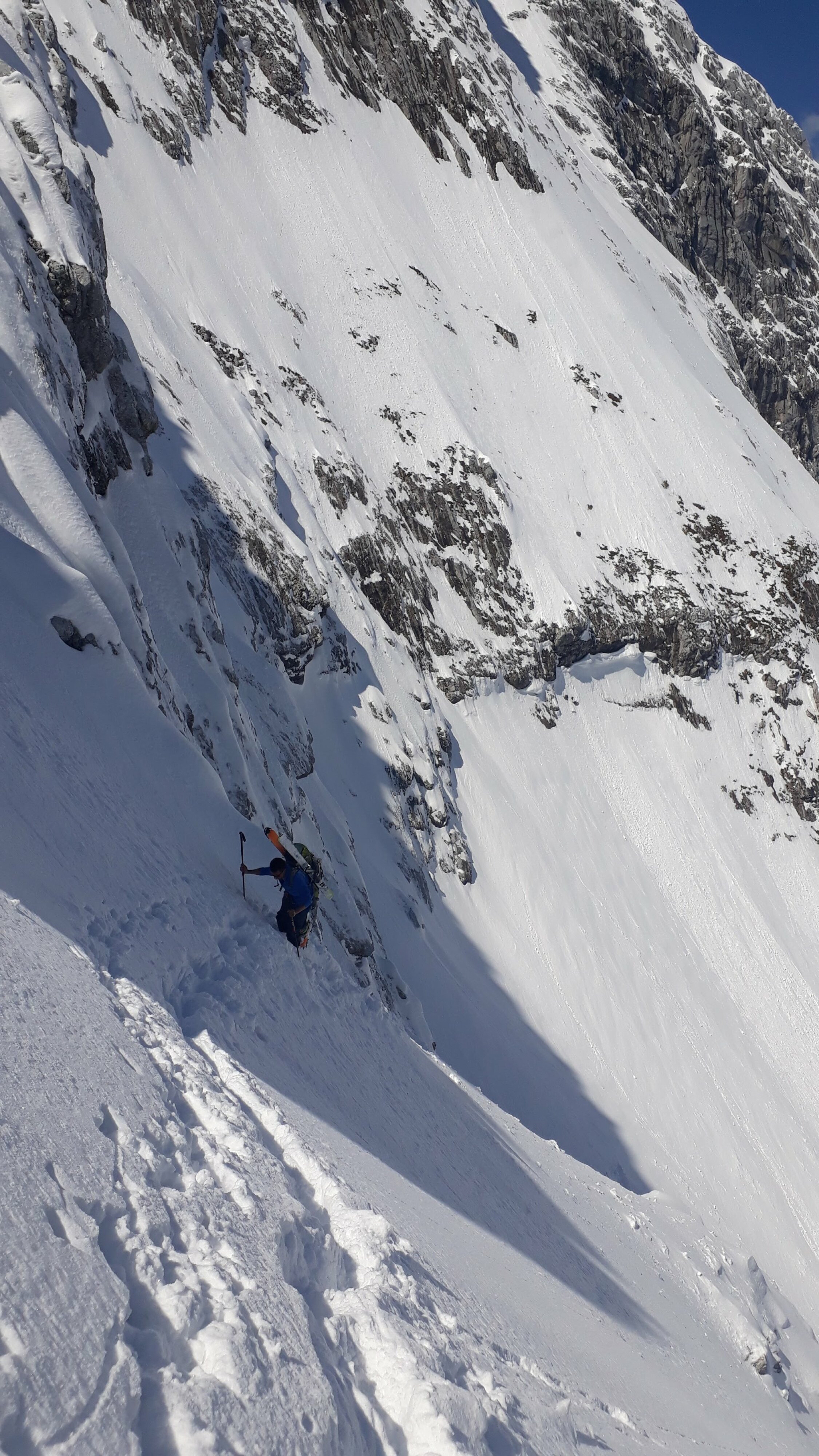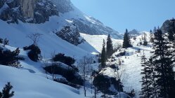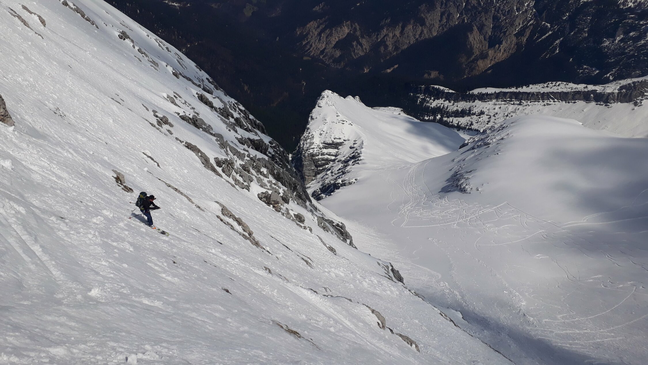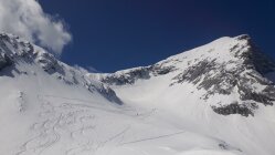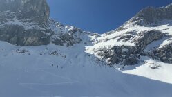 Der Aufstieg über die morgens blankeisähnliche Kandaharpiste ist im Augenblick noch bis auf eine kurze Tragepassage vom Parkplatz weg möglich (nur mit Harscheisen). Der weitere Aufstieg im oberen Bereich der Tour in weichem Schnee und guten Spuren und Tritten ist gut machbar. Ein großes Abfahrtsvergnügen wird man nicht mehr erleben, allerdings machen die grandiosen landschaftlichen Eindrücke alles mehr als wett.