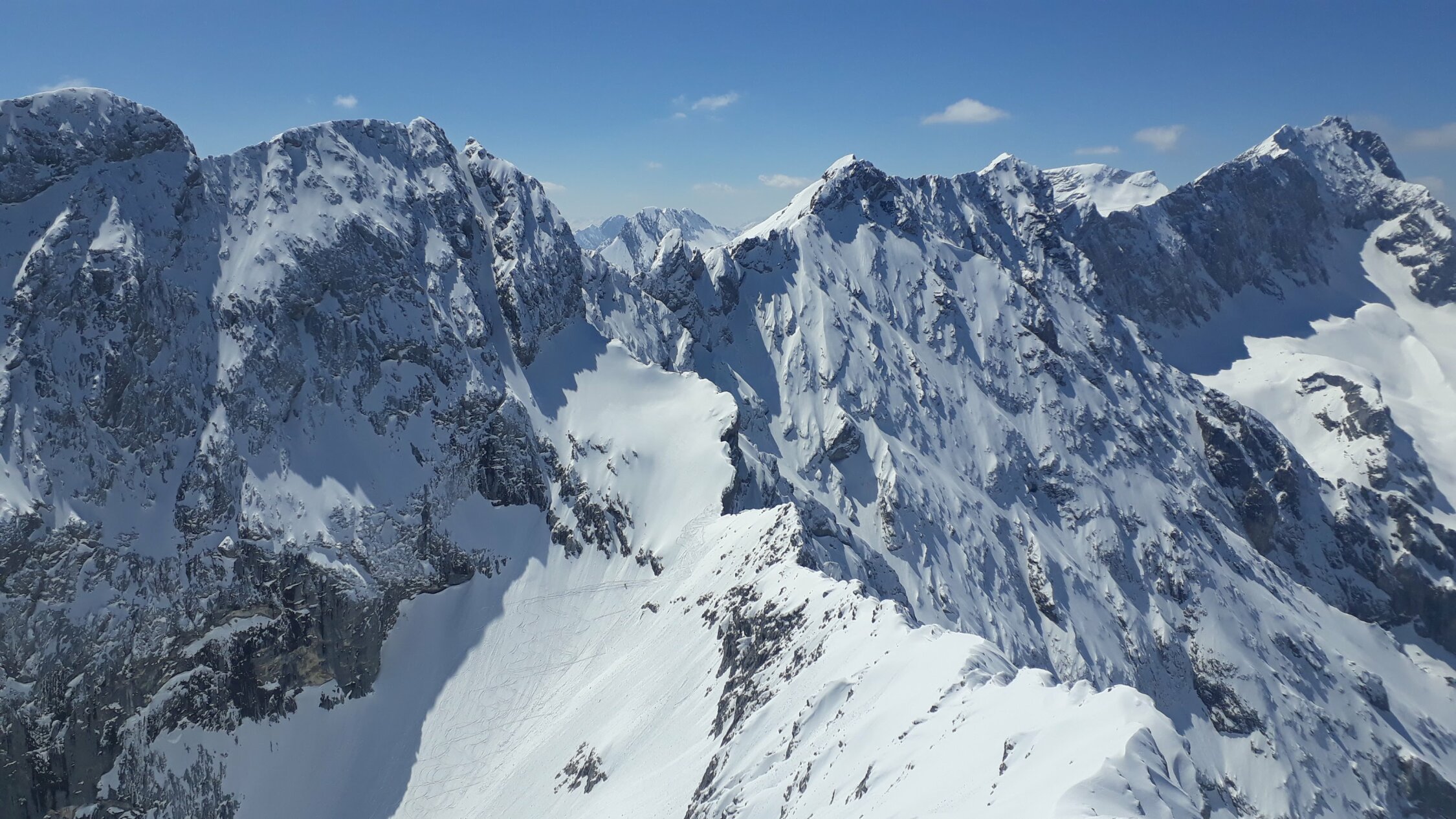 Zwei Allgäuer in Oberbayern! Was bedeutet, dass wir uns nicht auskennen, weil wir selber so viele Berge haben, dass wir hier noch nie waren. Deshalb nehmen wir aus Versehen die Gipfelstation der berühmten Kandaharabfahrt mit, als wäre die Tour nicht schon lange genug (zugegeben, so viele Höhenmeter gibts im Allgäu nur mit Spezialvarianten), was 150 zusätzliche Höhenmeter und einen tollen Blick auf die (von hier aus noch weit entfernte) Tagesroute beschert. Endlich drüben bei den Schöngängen erfreut uns die gute Skispur bis zum Beginn des Klettersteigs, der mit seinen sehr bequemen Trittspuren schnell hinter uns liegt. Trotzdem Steigeisen angelegt, damit wir sie nicht umsonst mitgenommen haben. Der Anstieg über den Ostgrat ist mit dem ständigen Blick auf den Blassengrat und hinunter ins Grieskar bei den heutigen Verhältnissen (weicher Schnee) ein hochalpiner Genuss ersten Ranges. Kein Wunder, dass hier jede Menge Leute unterwegs sind bzw. Hut ab vor den bergtüchtigen Oberbayern. Ist ja nicht gerade eine Nachmittagstour. Grandioser Gipfelausblick hinüber auf Deutschlands höchsten Berg und hinunter ins sehr weit unten gelegene Garmisch. Das Abfahrtsvergnügen war dann eher mäßig mit aufgeweichtem Schnee vom Gipfel weg bis zu sehr aufgeweichtem Schnee im Bernadeintal. Da war es schon fast ein Vergnügen, wieder auf festem Schnee den langen Gegenanstieg des Bernadeinlifts bei schönster Nachmittagssonne von vorne hochzustapfen.