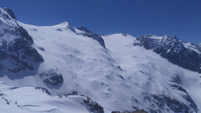 Piz Medel wird noch länger möglich sein. Viel Schnee und der Gletscher ist gut zugeschneit.