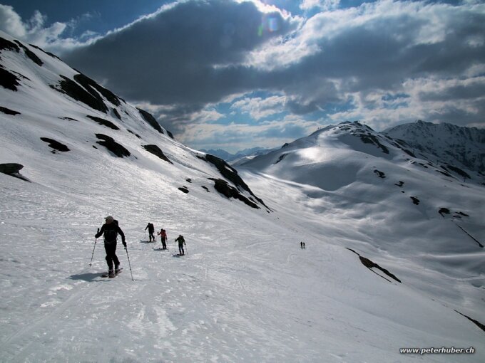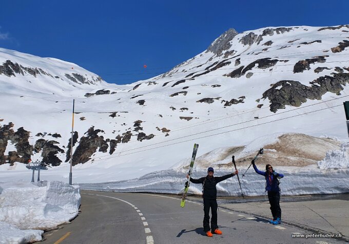 Wetter zuerst zogen Nebelbänke um dne Gipfel. Zum Glück kam dann viel Sonne hervor als wir auf dem Gipfel ankamen. Auf dem Pass noch sehr viel Schnee, ca 2 m. Unterwegs zwei ganz kurze Stellen zwischen den Steinen, wo die Skis kurz getragen werden müssen. Morgens trug der Schnee recht gut. Gipfelhang dann sehr hart. Wir sind ohne Harscheisen bis ca 20 m unter den Grat aufgestiegen. Grat hat sehr viel Schnee und der Gipfel kann gut erreicht werden.