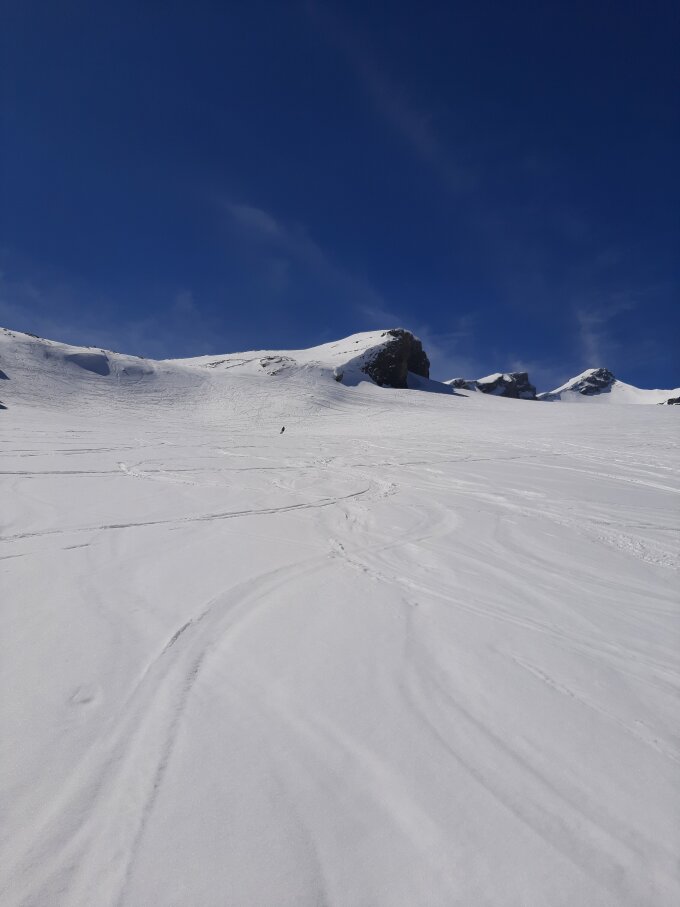 Abfahrt: Schöne Sulzschwünge bis zum See, dann zeigte sich ab 11.45h der bremsende Sommerschnee in dieser Saison bei uns das erste Mal.