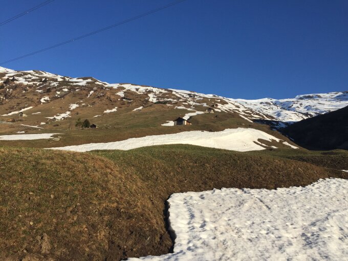 Direkt über dem Ort Hinterrhein sind die Hänge schon so gut wie aper. Bei genauem Hinschauen finden sich aber noch durchgehende Schneeflecken, mit der sich die Tragstrecke verkürzen lässt. Ab ca 1900m hat es dann genügend Schnee. Bei der Abfahrt oben noch Pulver, unten schöner Sulz.