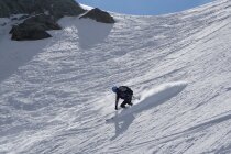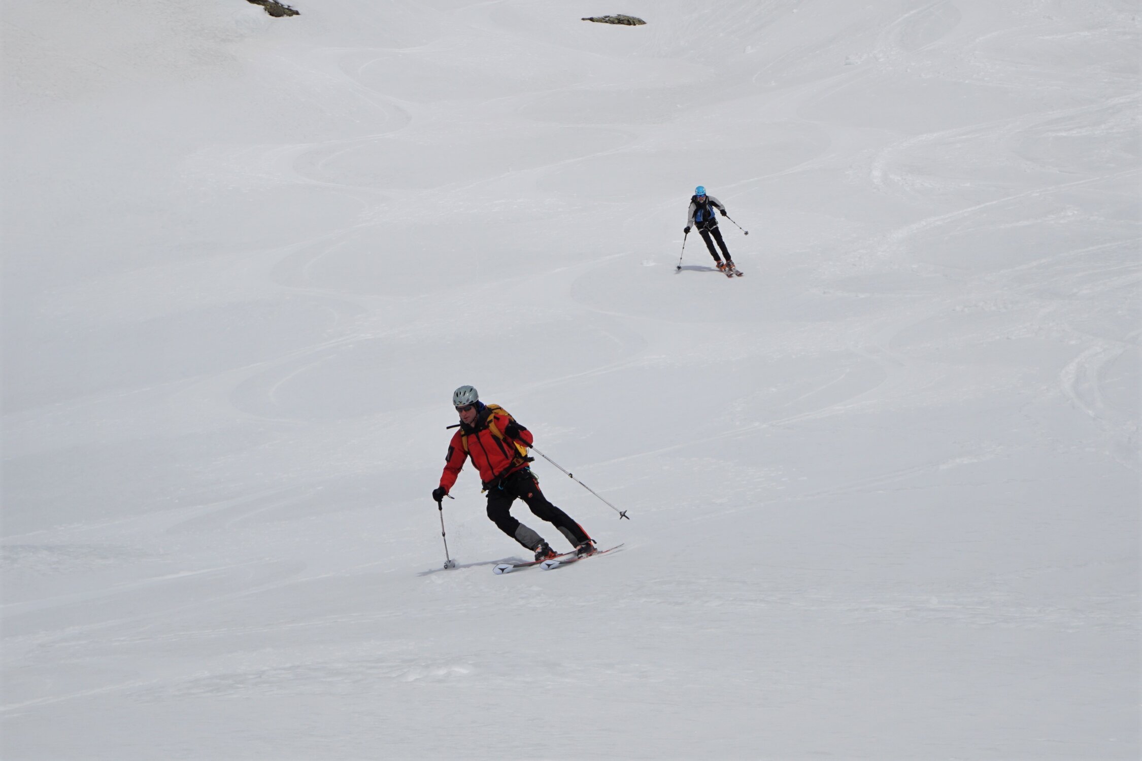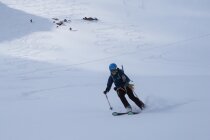 Abfahrt nordseitig über Plan Rai noch pulvrig. Ostseitig retour zur Hütte schön aufgefirnt.