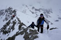 Sehr gute Schneelage. Gute Spur bis kurz unter den Sattel. Dort einige Meter zu Fuß. Gipfelgrat problemlos.